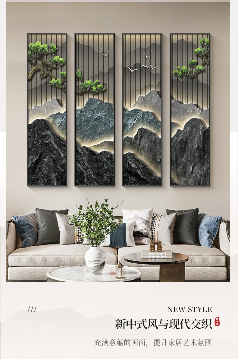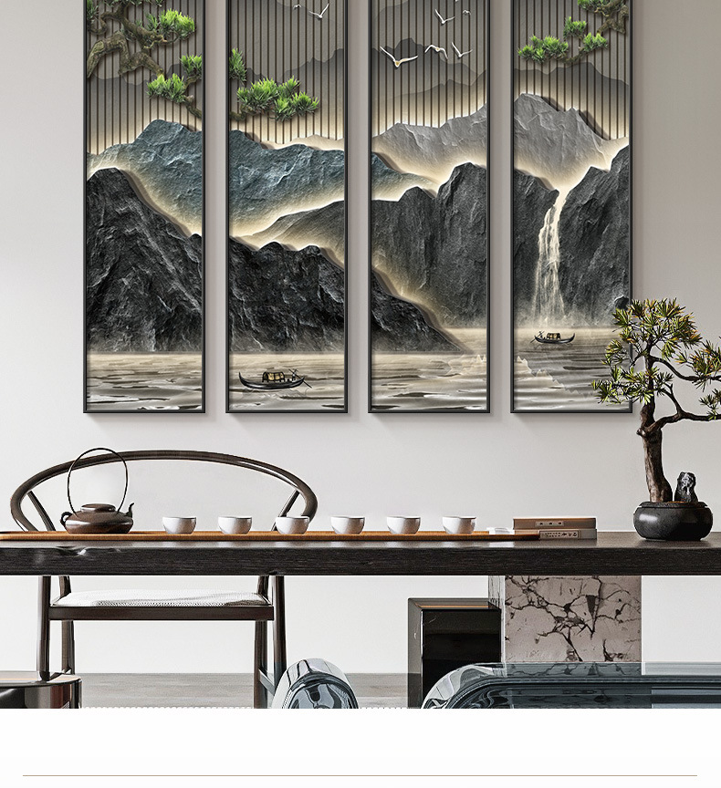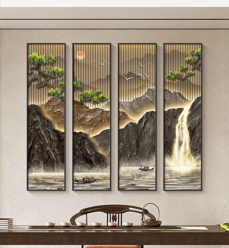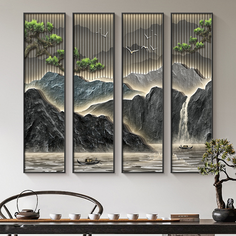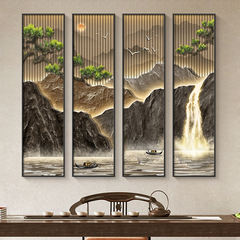 Phòng khách kiểu Trung Quốc mới treo bức tranh nước chảy giàu có sofa nền trang trí tường bức tranh phong cảnh bốn bức tranh tường phòng trà