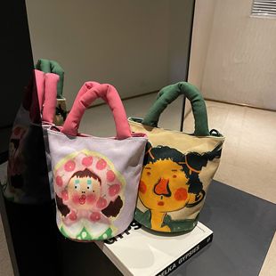 樱桃小丸子卡通涂鸦水桶包包女2023春夏新款帆布手提单肩斜挎女包 |