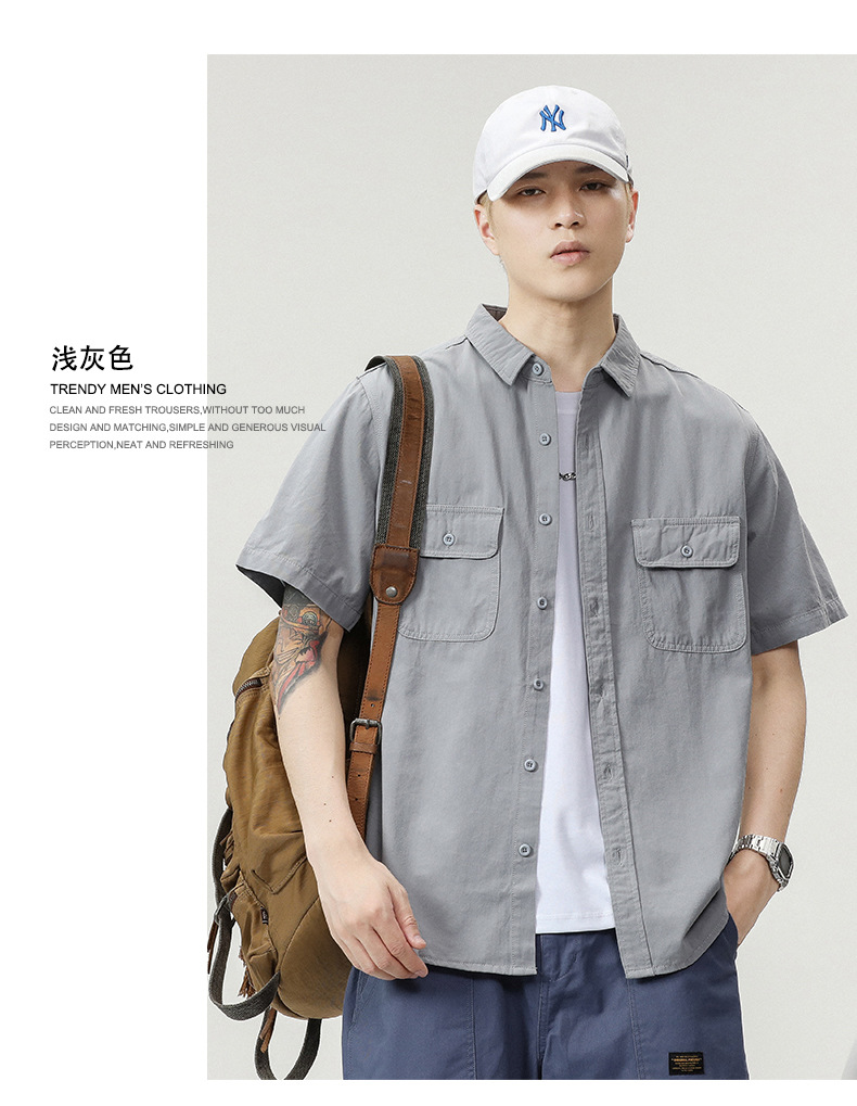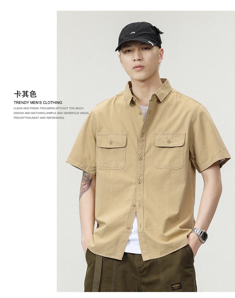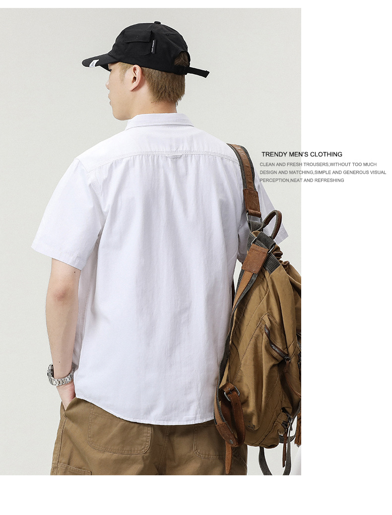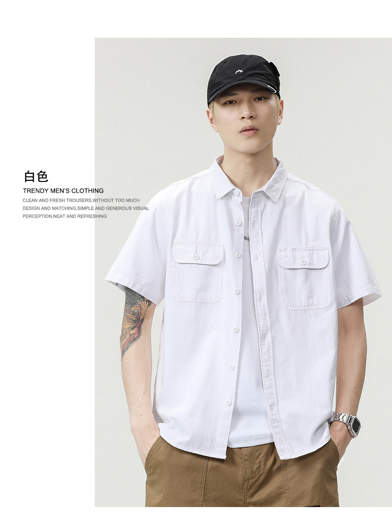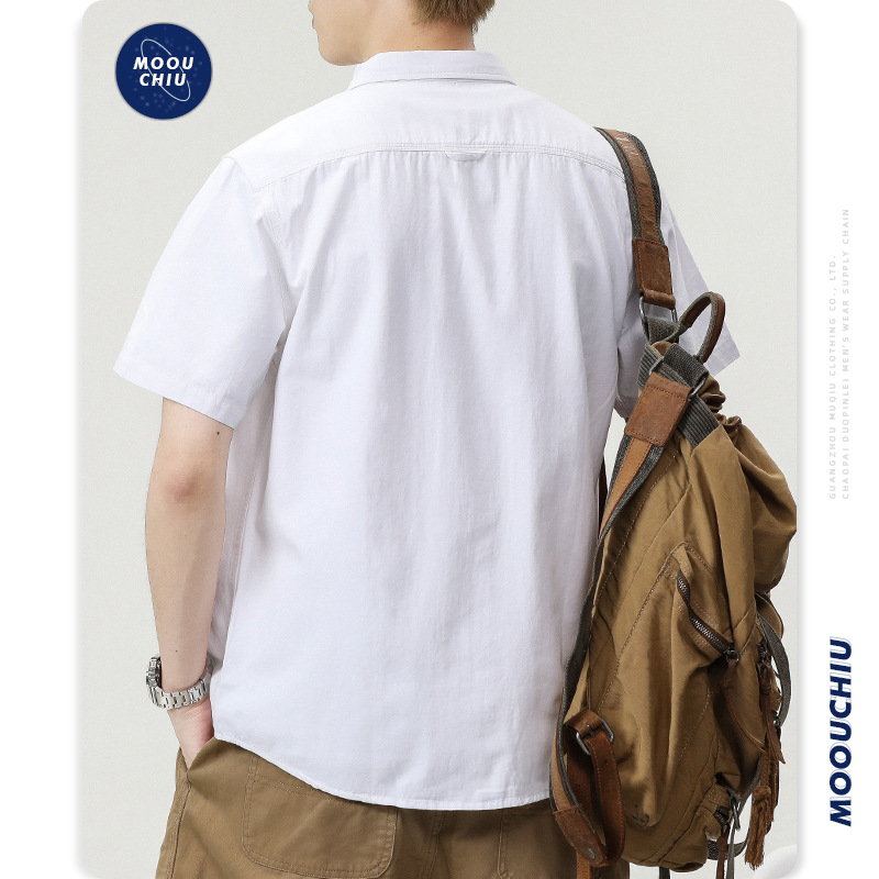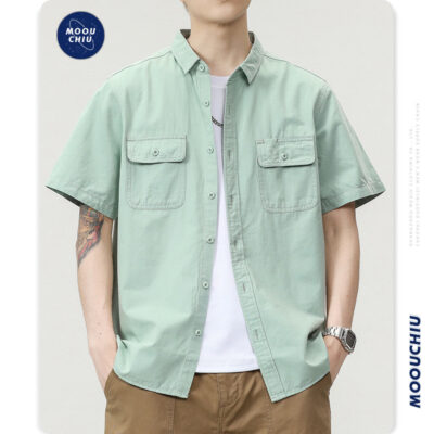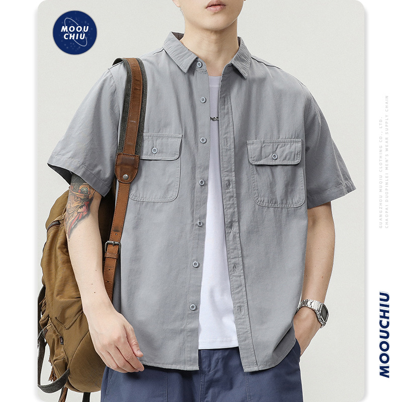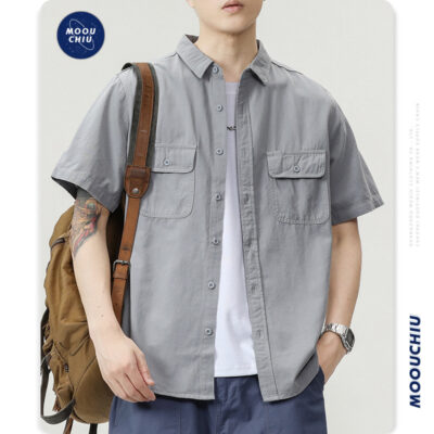 Quần áo nam Muqiu∣Áo sơ mi nam ngắn tay Mùa hè thương hiệu hợp thời trang của Mỹ Quần áo bảo hộ lao động Nhật Bản Áo sơ mi có ve áo cotton được giặt dày