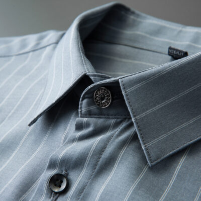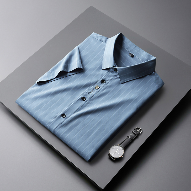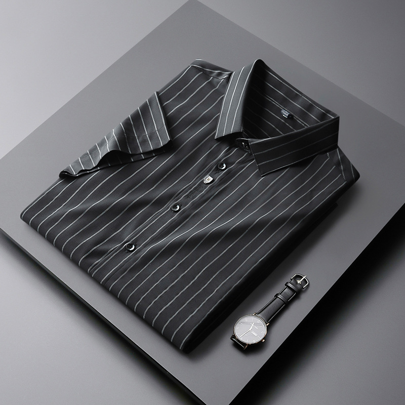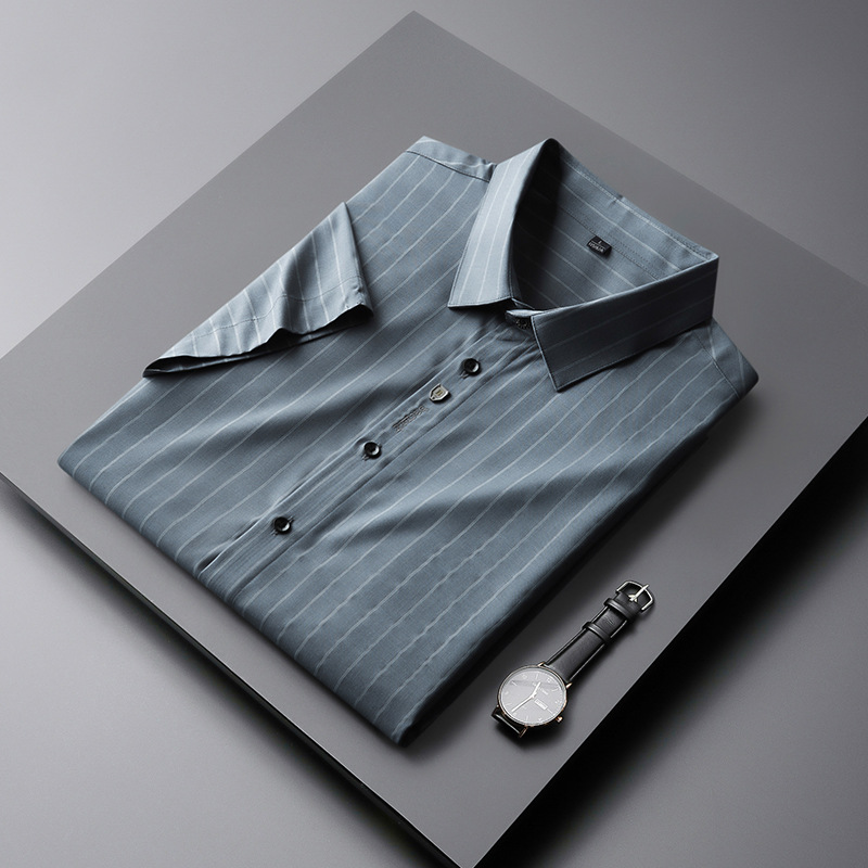 Quần áo nam Shen Geng丨Áo sơ mi sọc lụa băng cao cấp dành cho nam Áo sơ mi liền mạch ngắn tay công sở mùa hè