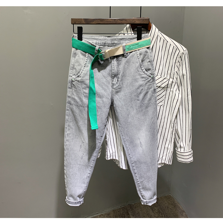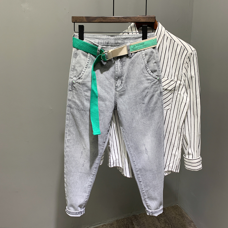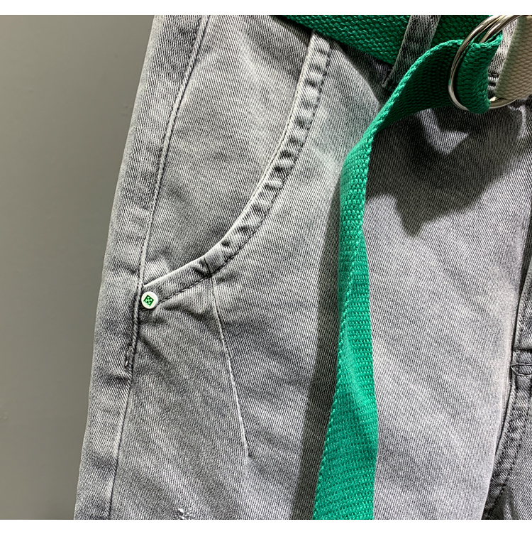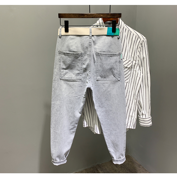 Quần jean chín điểm màu xám nhạt nam triều thương hiệu cá tính túi xiên cổ điển cũ và hơi thu gọn quần bút chì mỏng giản dị