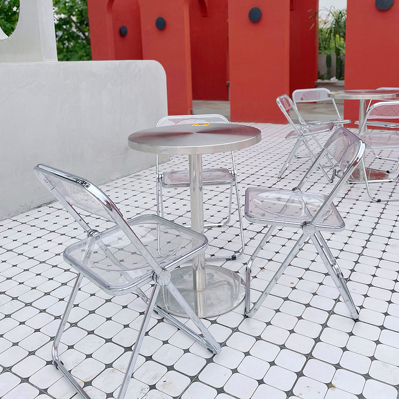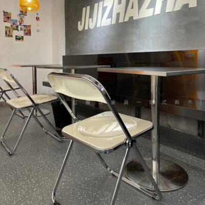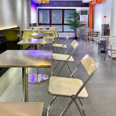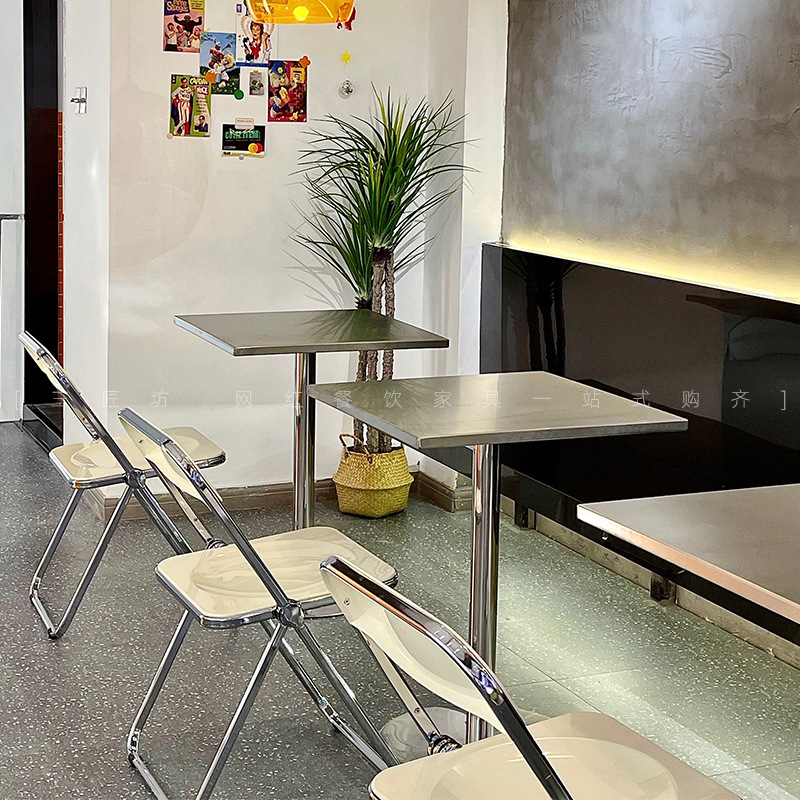 Quán trà sữa tráng miệng phong cách công nghiệp bàn ghế cafe ins trắng ghế xếp inox bàn vuông phối lưới đỏ shop