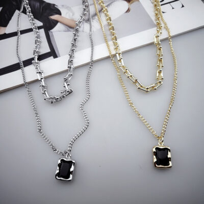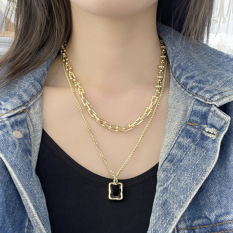 Retro Đá Quý Màu Đen Vòng Cổ 2 Lớp Khóa Móng Ngựa Kim Loại Gió Hip Hop Vòng Cổ Áo Len Dây Chuyền Cá Tính Âu Mỹ Dây Chuyền Xương Đòn Nữ
