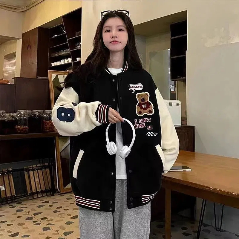 Retro lưới sinh viên gấu đỏ đồng phục bóng chày áo len nữ quần áo xuân thu phong cách Hồng Kông cỡ lớn giảm béo tất cả các trận đấu áo khoác áo khoác hợp thời trang