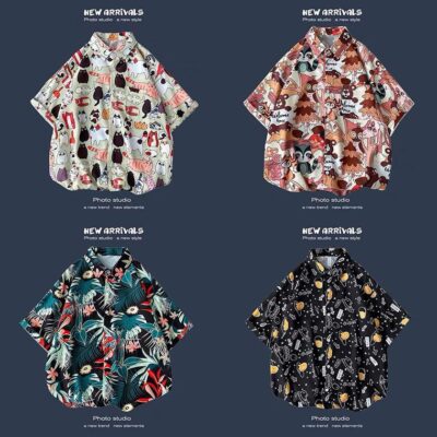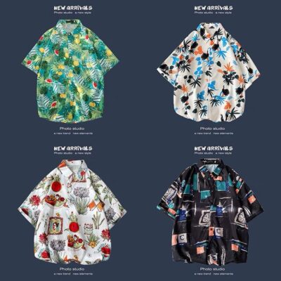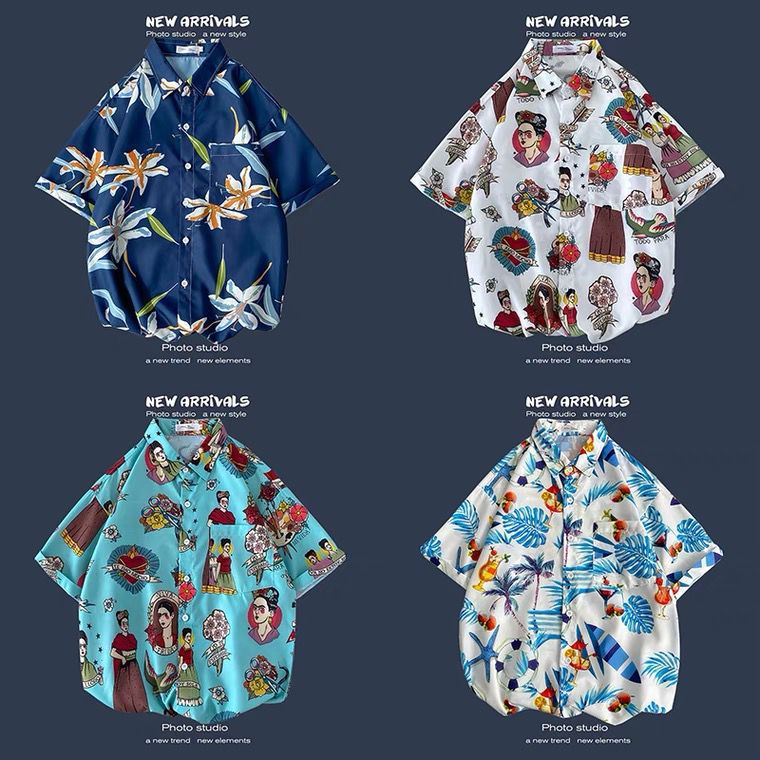Retro Mỹ Vintage Nhật Bản Hoa Áo Sơ Mi Nam Ngắn Tay Mùa Hè Hồng Kông Phong Cách Kẻ Lưu manh Đẹp Trai Rời Cặp Đôi Đi Biển Áo Sơ Mi