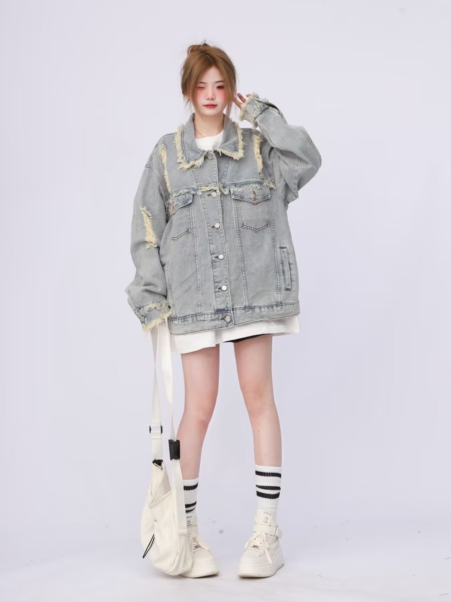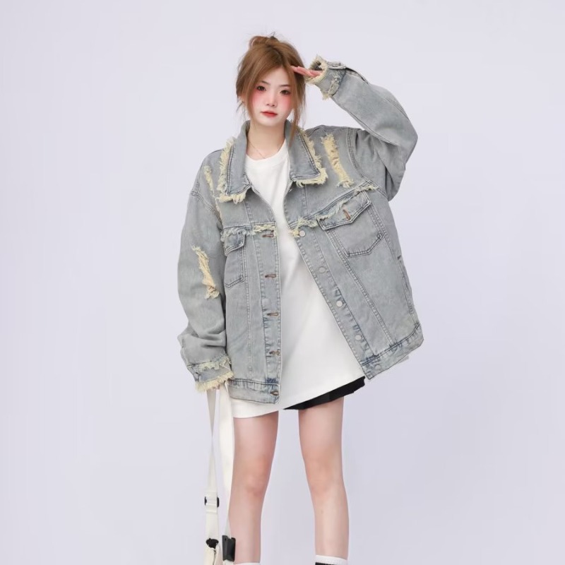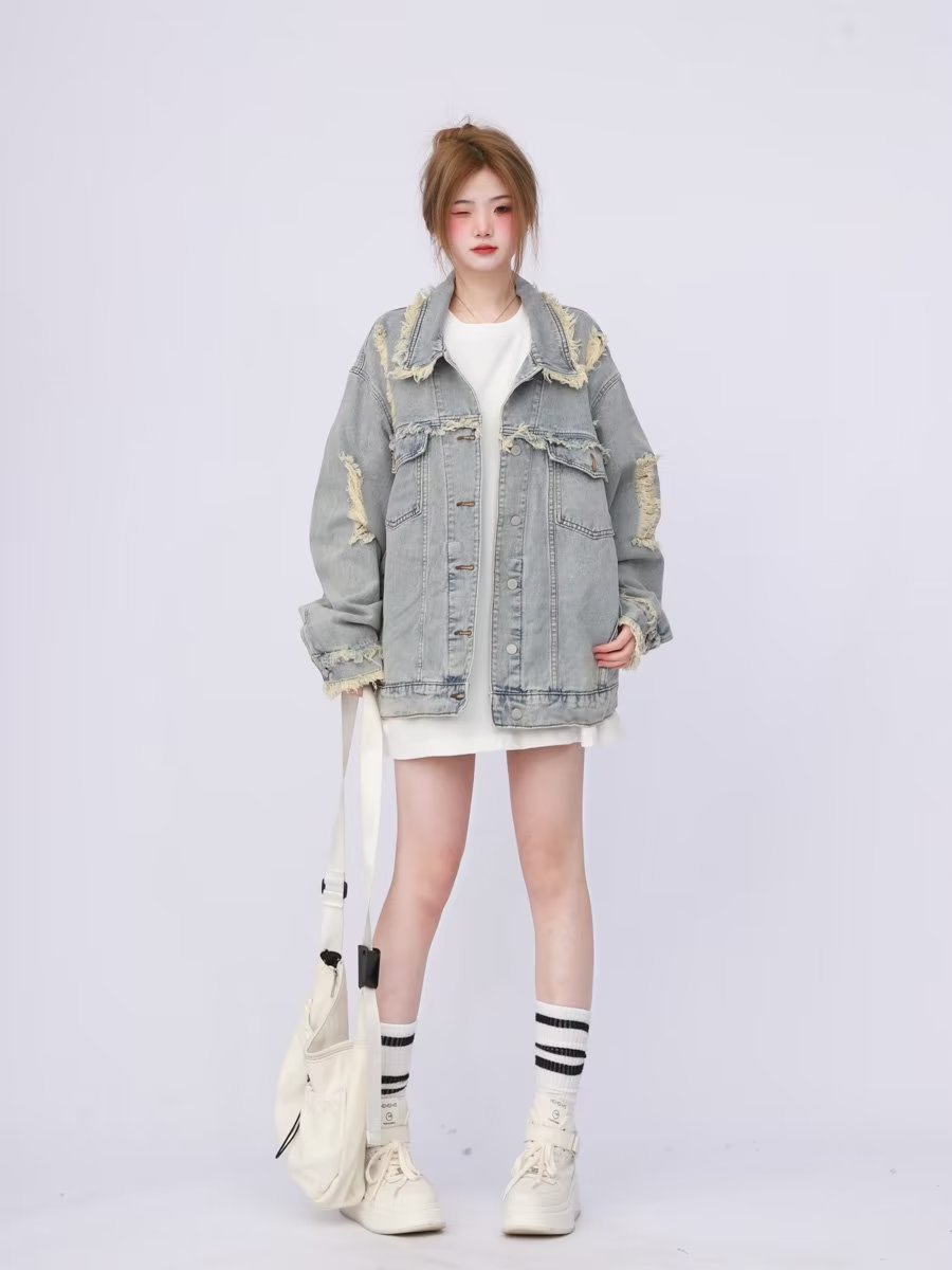 Retro thô cạnh làm cũ rách áo khoác denim nữ mùa xuân và mùa thu lỏng lẻo giản dị tất cả các trận đấu dụng cụ áo khoác thủy triều ins