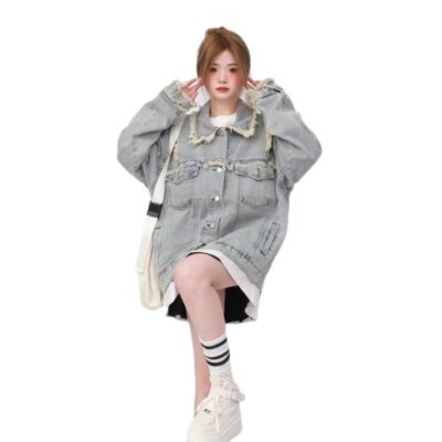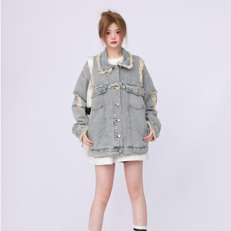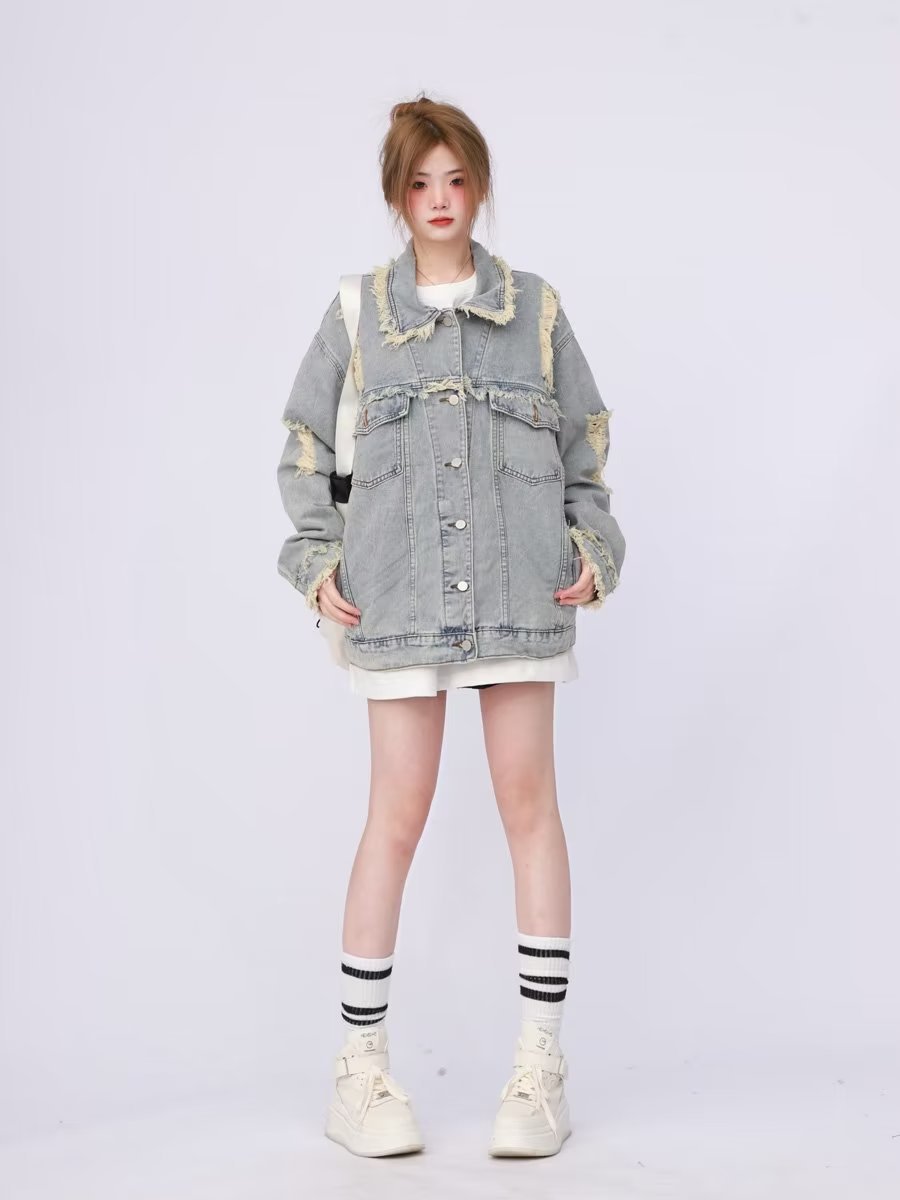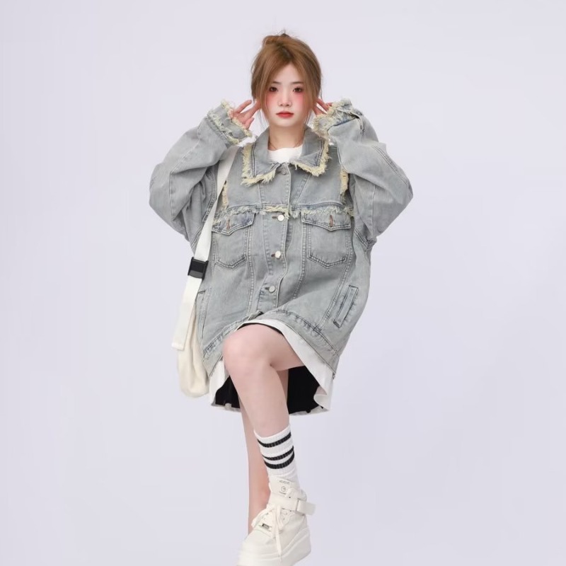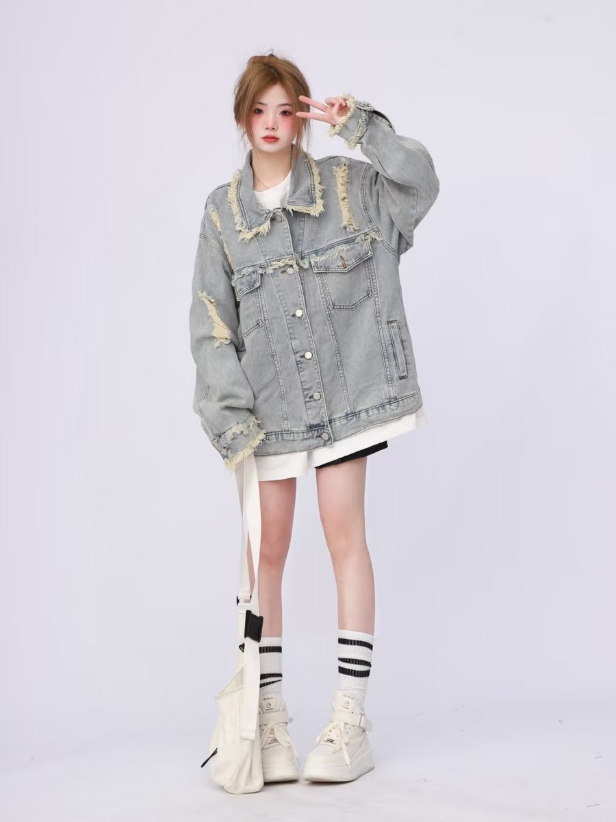 Retro thô cạnh làm cũ rách áo khoác denim nữ mùa xuân và mùa thu lỏng lẻo giản dị tất cả các trận đấu dụng cụ áo khoác thủy triều ins