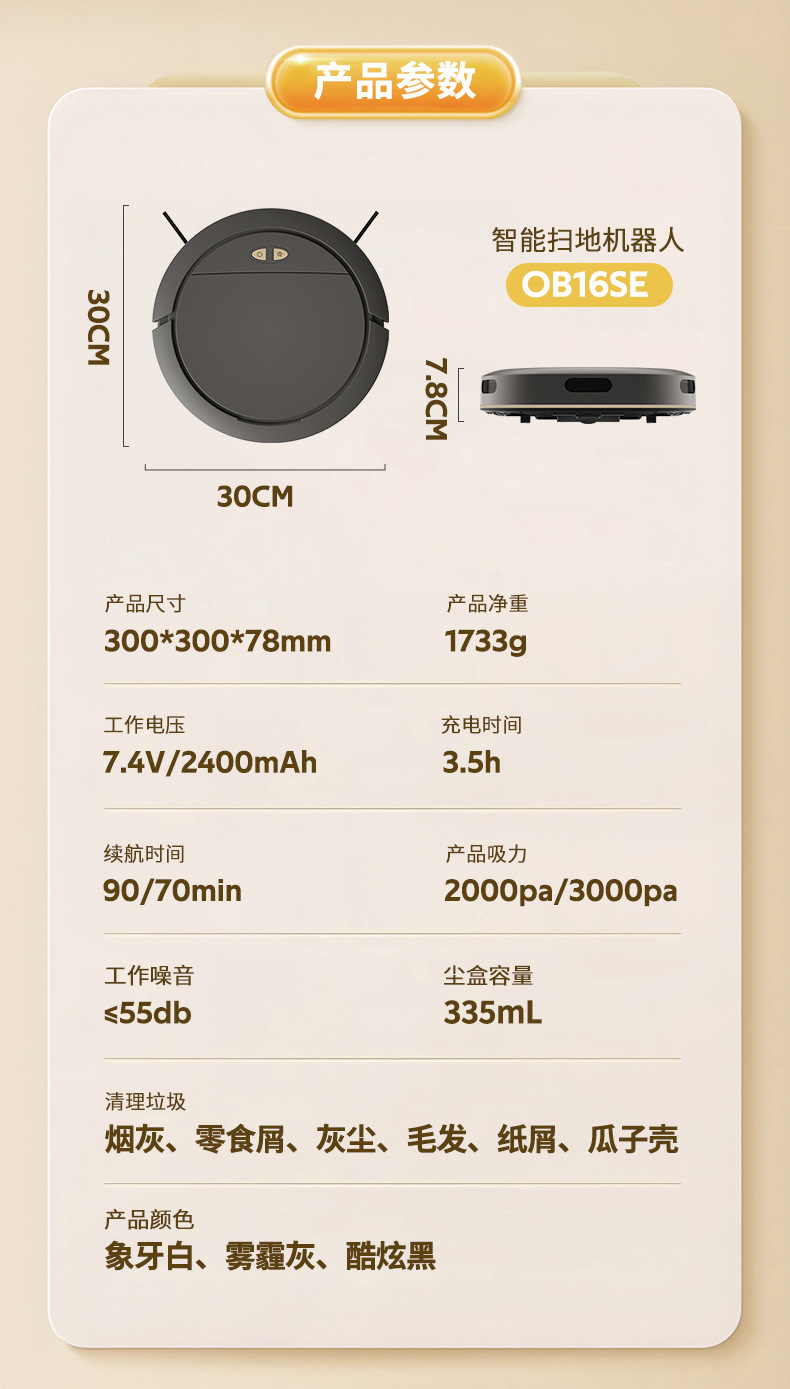 Phương thức cấp nguồn: AC Ngoại hình: Robot quét Màu sắc: Đen mát/Trắng ngà/Trắng ngà Model: OB16 SE Loại chứng chỉ: Được chứng nhận 3C Kiểu máy quét: Robot thông minh Loại công tắc: Nút thông thường Môi trường sử dụng: Điện áp định mức hộ gia đình: 110-240V Dù có là một bức tường ảo: Không Cho dù đó là nguồn cung cấp độc quyền xuất khẩu xuyên biên giới: Có Số chứng chỉ: 2023180708048051 Chức năng quét: Loại kéo, quét và hút Số sản phẩm: OB16 SE Thương hiệu: Oubao Thông số kỹ thuật sản phẩm: Phiên bản trung lập tiếng Anh Số chứng chỉ 3C : 2023180708048051 Công suất định mức: 26W Màn hình LCD: Không có Chế độ hoạt động: Điều khiển từ xa cơ học sử dụng kép Nền tảng hạ nguồn chính: ebay/Amazon/wish/AliExpress/Trạm độc lập/LAZADA/LAZADA Có các thương hiệu tư nhân được ủy quyền: Có Lộ trình làm sạch: Loại kế hoạch với điều khiển từ xa: Không Khu vực áp dụng: hơn 150 mét vuông Bảo vệ va chạm: Chức năng hẹn giờ va chạm cơ học: hơn 8 giờ Tần số định mức: 50-60HZ Có nên sạc tự động hay không: Không Có chức năng cuộc hẹn theo lịch trình hay không: Có Khu vực bán hàng chính: Châu Âu /Nam Mỹ/Đông Nam Á/Bắc Mỹ/Đông Bắc Á/Trung Đông/Trung Đông Dung tích: 400ml