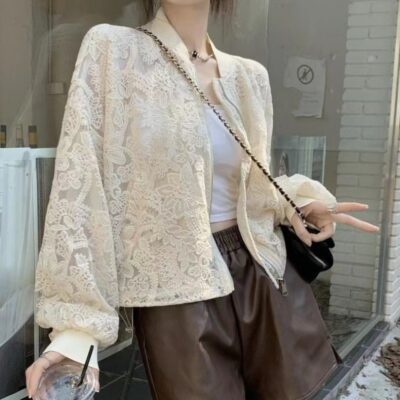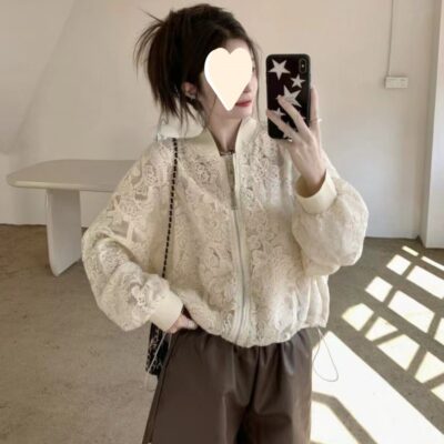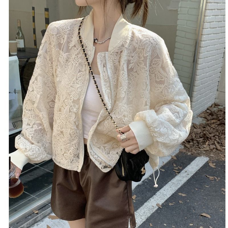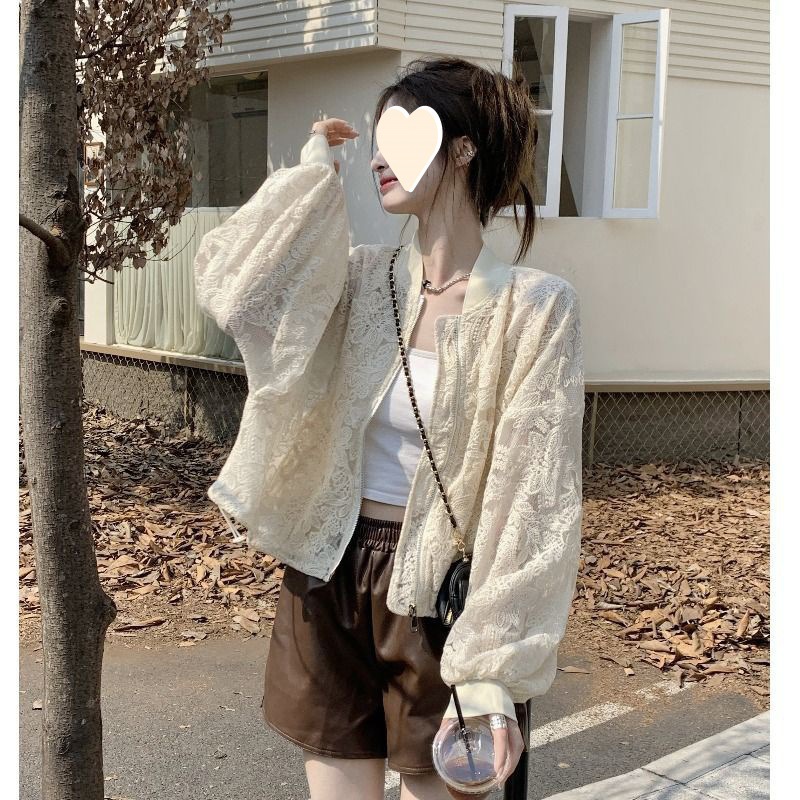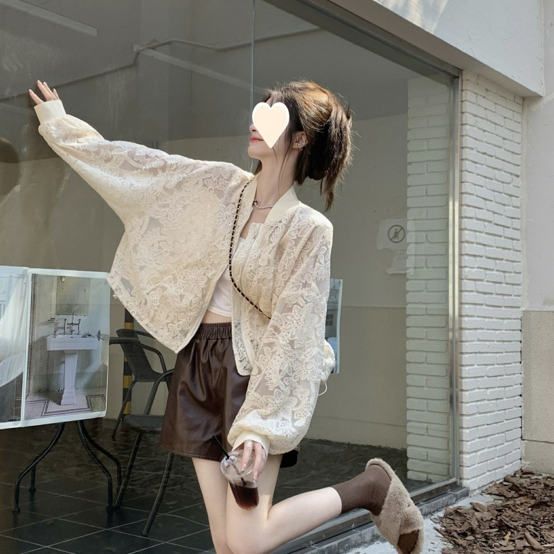 Rỗng ren áo khoác ngắn nữ mùa hè 2023 mới nhỏ sơ mi rời cao cấp đồng phục bóng chày cardigan chống nắng quần áo