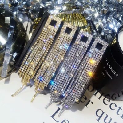 S925 Bạc Vuông Thời Trang Âu Mỹ Tính Khí Bông Tai Tua Rua Dài Siêu Kim Cương Giả Bông Tai Kim Bạc Cho Nữ