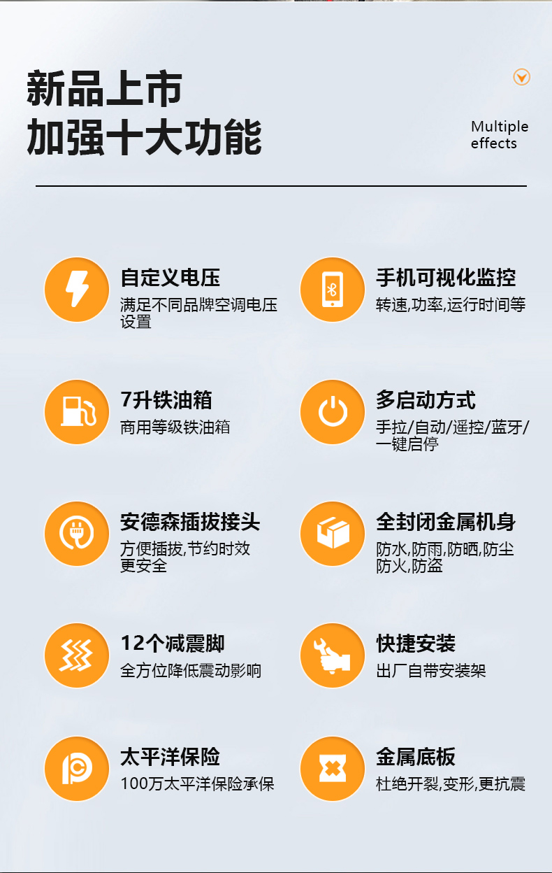 启动方式:无电手拉启动,电启动,遥控启动,蓝牙调节电压和启动操控