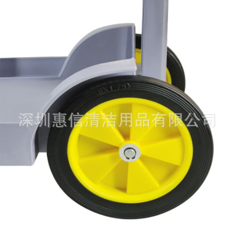 【产品介绍】轻巧灵活,外型美观,利于环保。采用优质材料制造,经久耐用。后部大脚轮,前部旋转脚轮,轻便灵活,不会在地板上留下痕迹。前部平台可放置垃圾桶用来收集垃圾,或放置拖把,水桶,榨水车等组合以从事地板清洁工作。凹槽便于存放各种有柄的工具和设备。