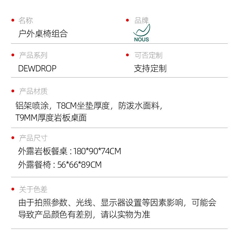 Mã sản phẩm: NT1124 Thương hiệu: NOUS Màu sắc: Bàn ăn lộ thiên/Ghế ăn lộ thiên/Ghế ăn lộ thiên Model: NT1124 Phương pháp gia công: Tùy chỉnh theo bản vẽ Thông số kỹ thuật: Bàn ăn lộ thiên: 180*90*74cm Ghế ăn lộ thiên: 56*66 *89cm Cho dù giao hàng tận nơi: Giao hàng ở tầng trên Cho dù dịch vụ lắp đặt có được cung cấp hay không: Không Nền tảng hạ nguồn chính: ebay/Amazon/wish/AliExpress/Independent Station/LAZADA/LAZADA Có thương hiệu tư nhân được ủy quyền hay không: Có Đây có phải là người nộp thuế chung không : Có Chất liệu : Hợp kim nhôm được xuất khẩu độc quyền để cung cấp xuyên biên giới Nguồn: Có Khu vực bán hàng chính: Châu Phi/Châu Âu/Nam Mỹ/Đông Nam Á/Bắc Mỹ/Đông Bắc Á/Trung Đông/Trung Đông Phong cách: Hiện đại và đơn giản