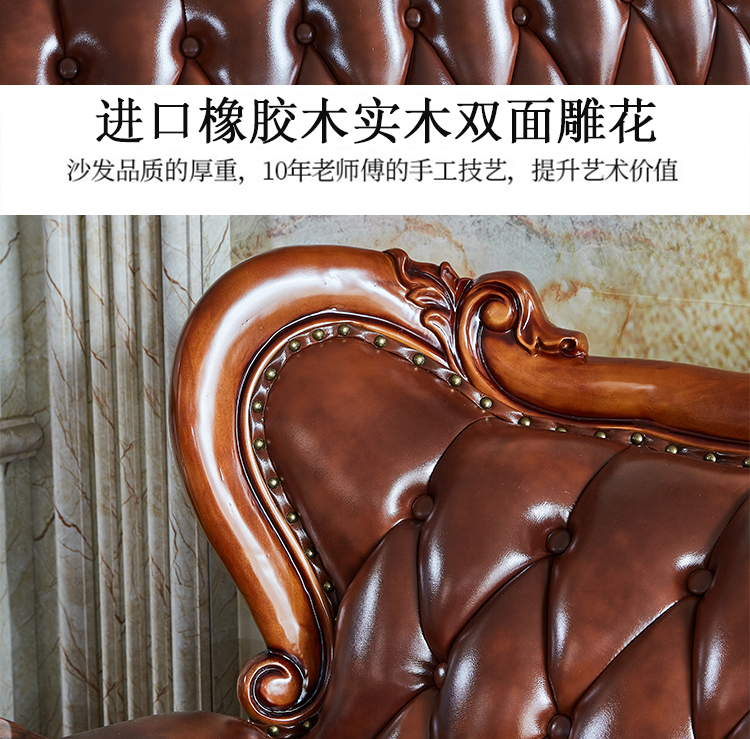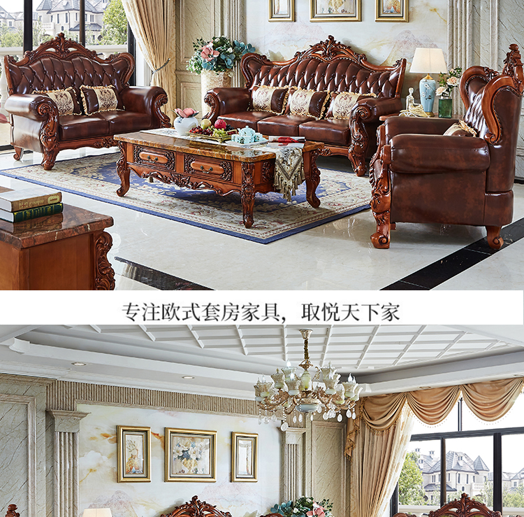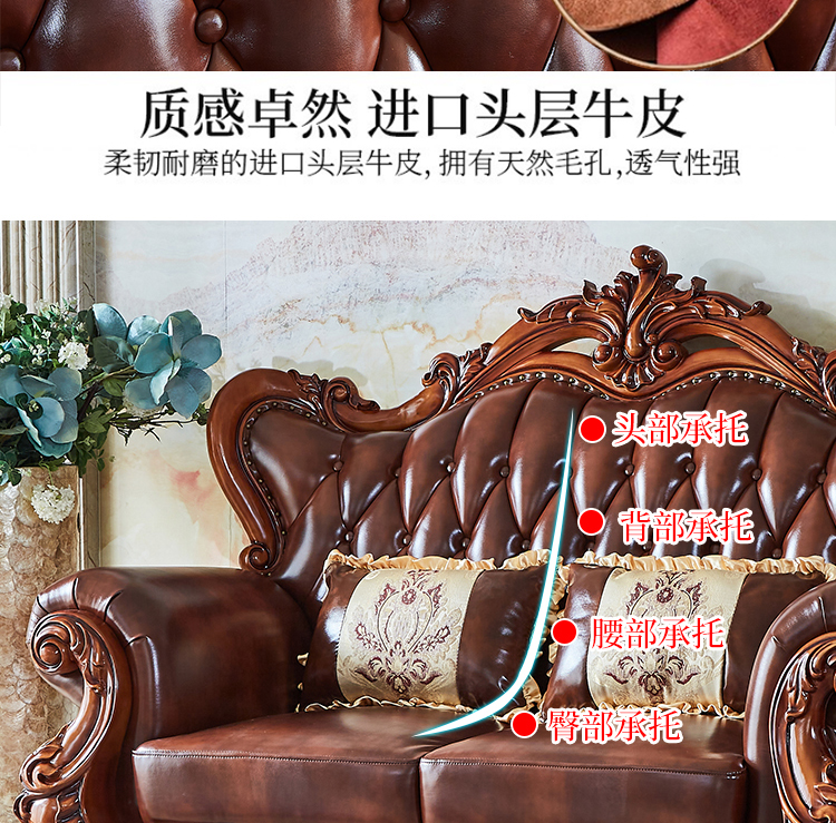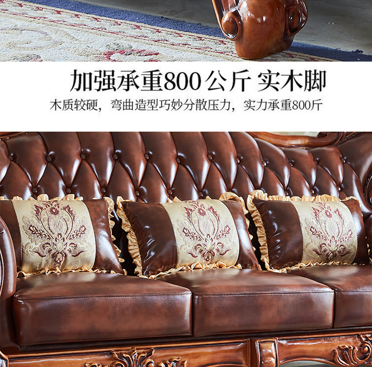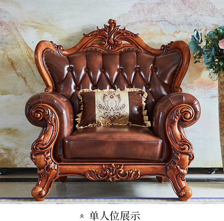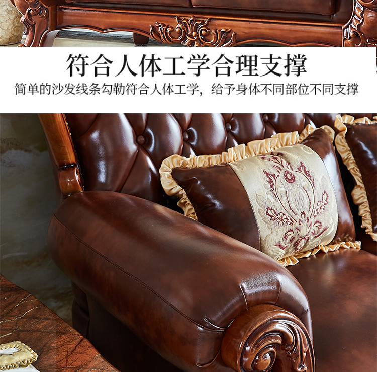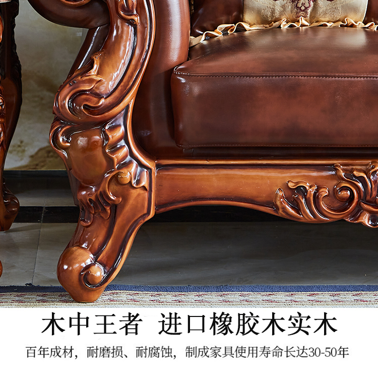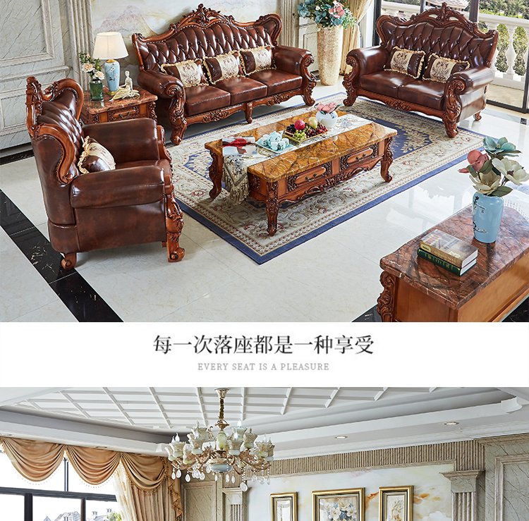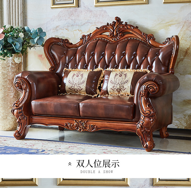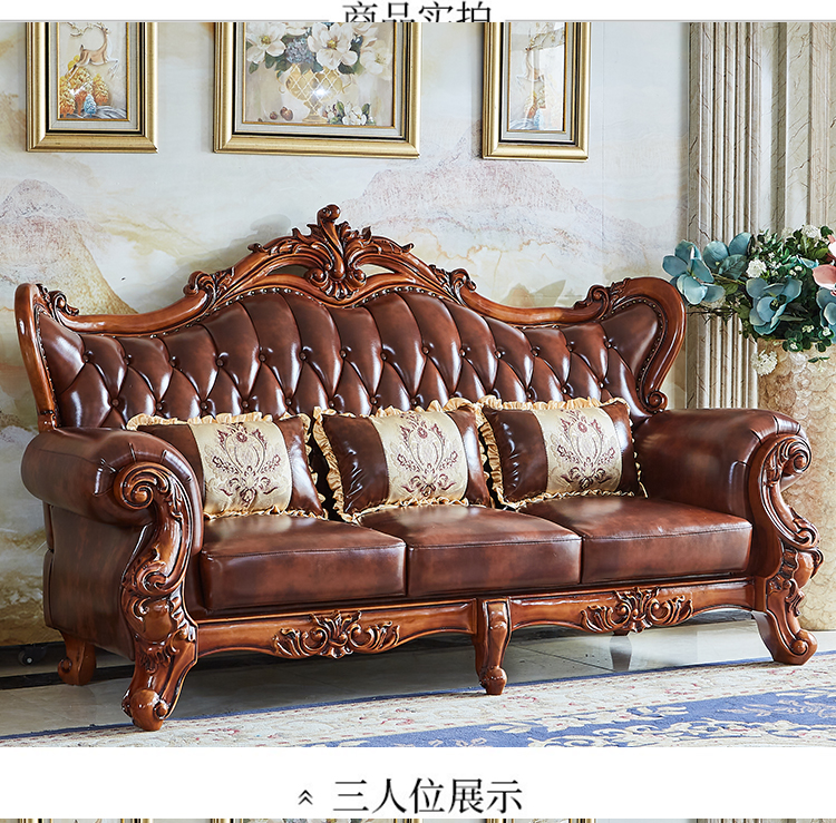 Sofa da Châu Âu 123 phòng khách kết hợp hình chữ U toàn bộ bằng gỗ nguyên khối chạm khắc 2 mặt Bộ sang trọng của Mỹ nội thất tối màu