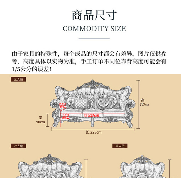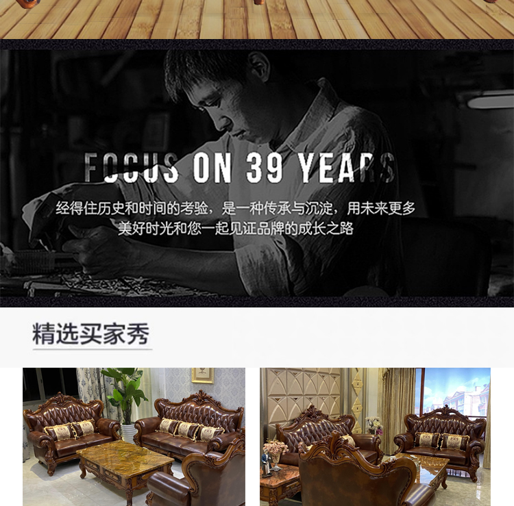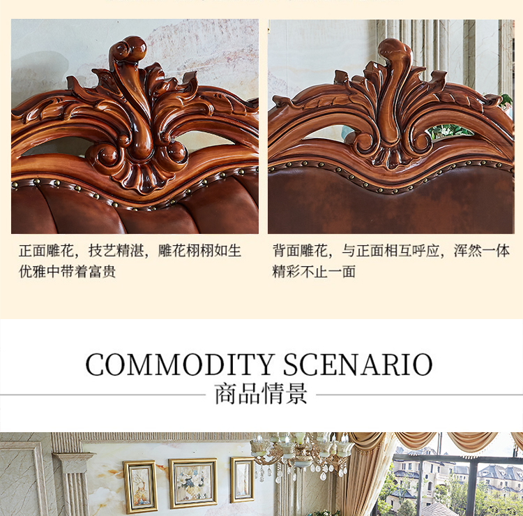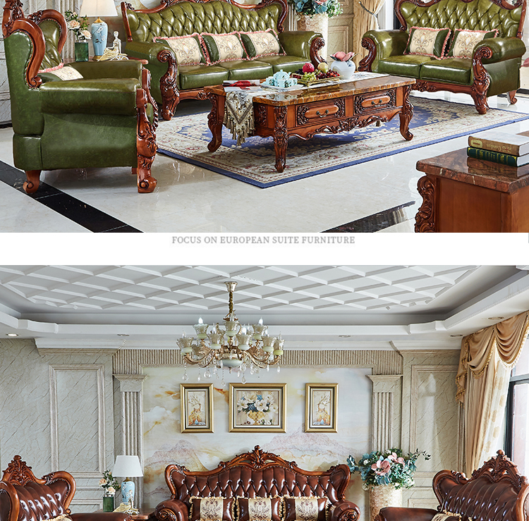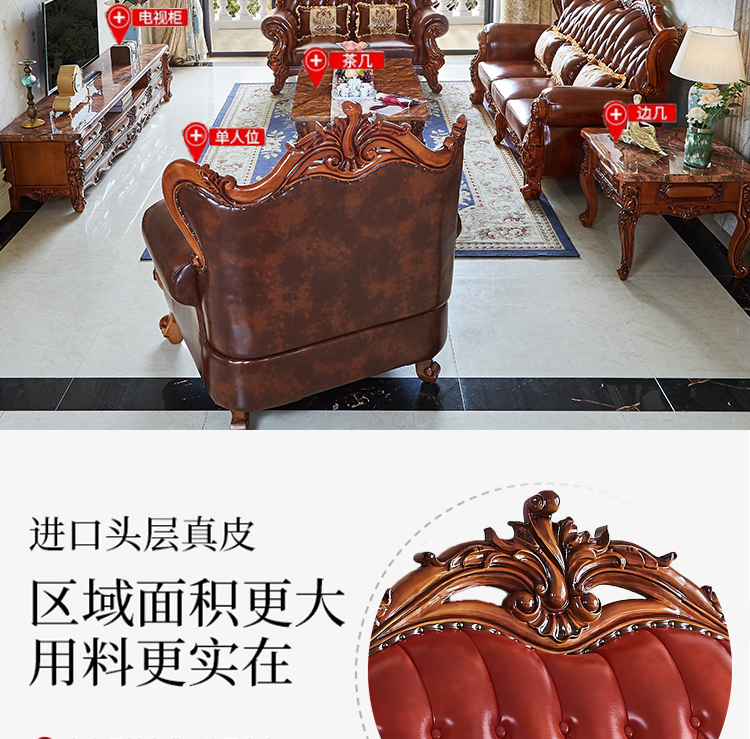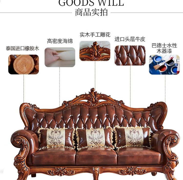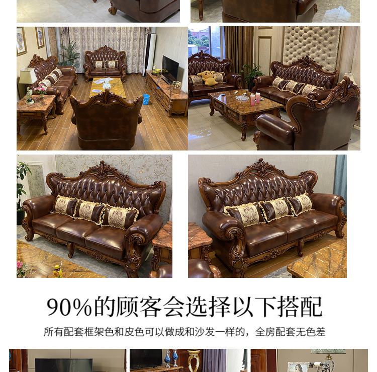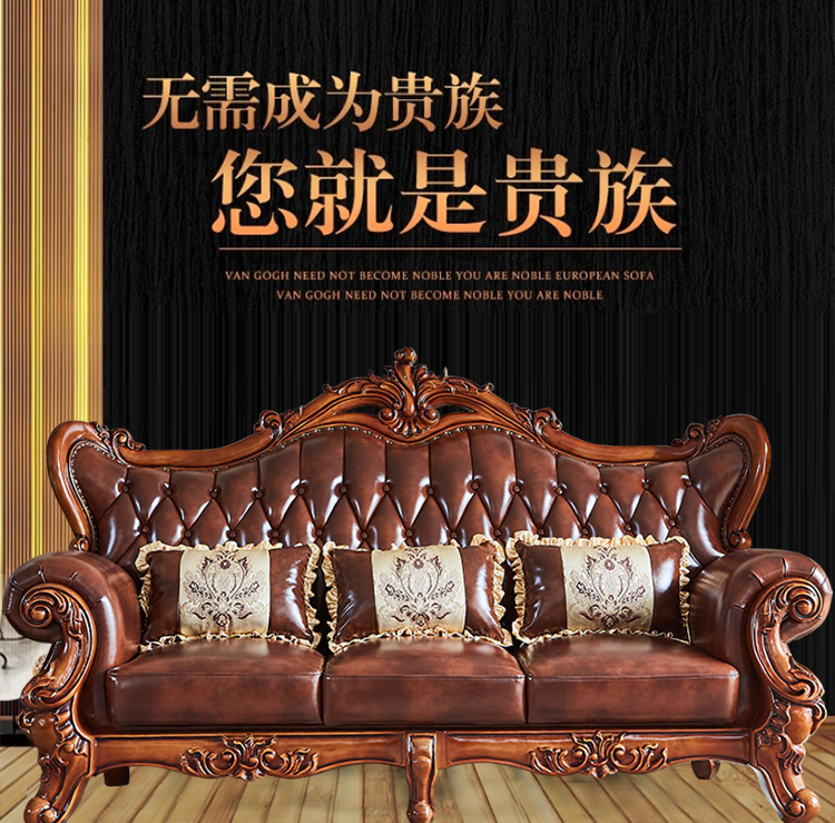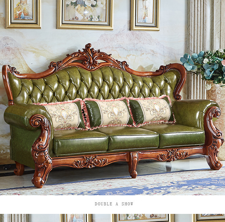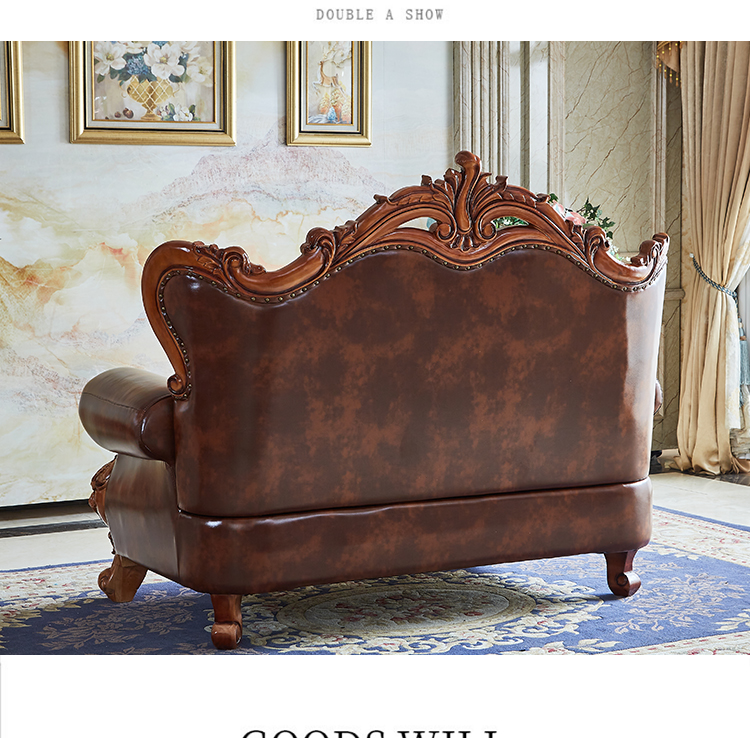 Sofa da Châu Âu 123 phòng khách kết hợp hình chữ U toàn bộ bằng gỗ nguyên khối chạm khắc 2 mặt Bộ sang trọng của Mỹ nội thất tối màu