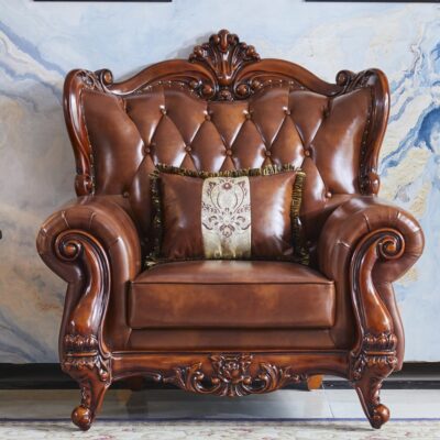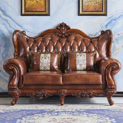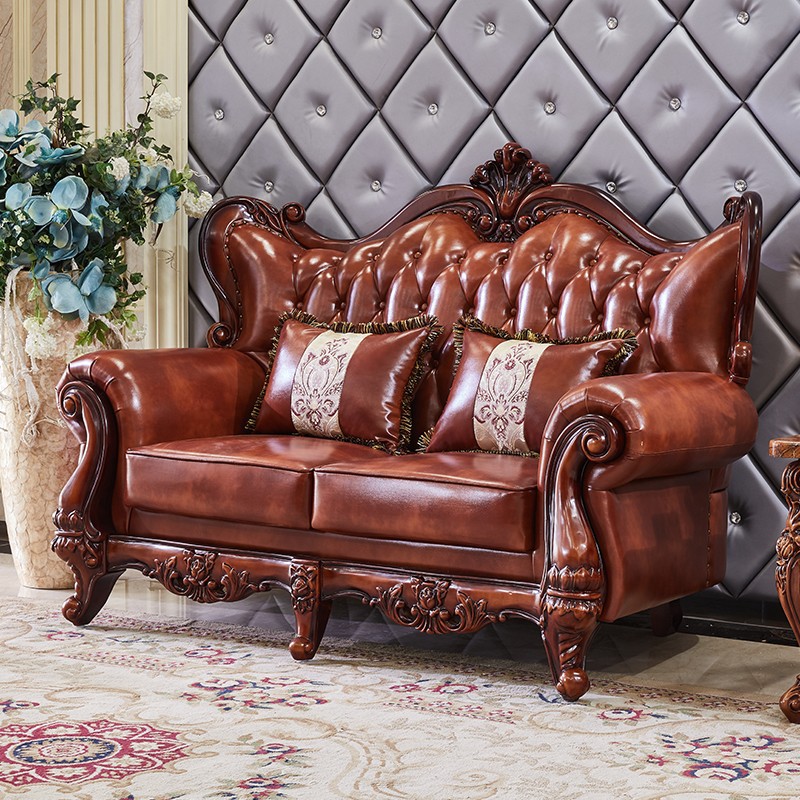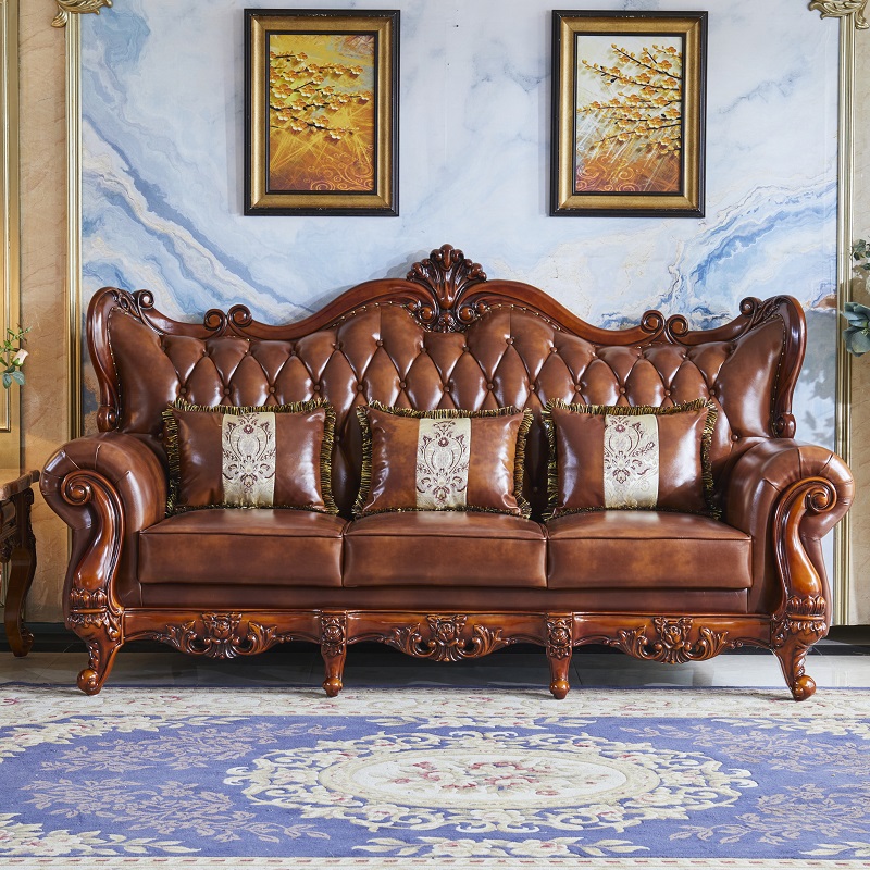 Sofa da phong cách Châu Âu mới phòng khách kết hợp gỗ nguyên khối hai mặt chạm khắc lớp đầu da bò quy mô lớn Nội thất kiểu Mỹ