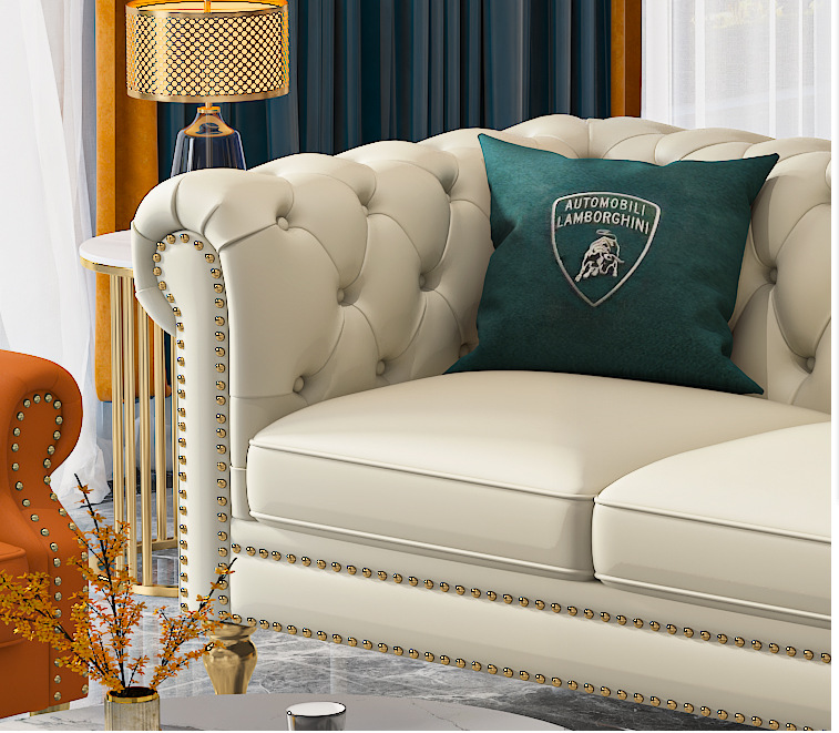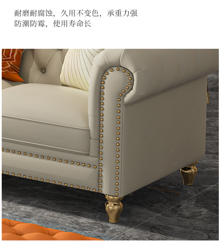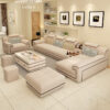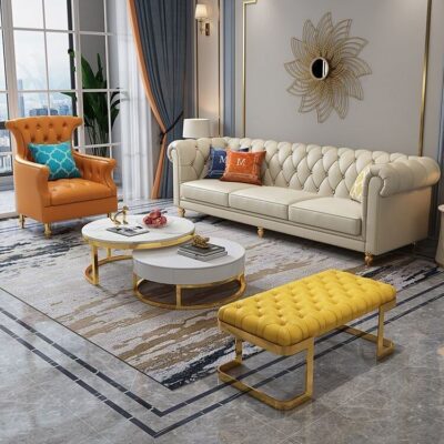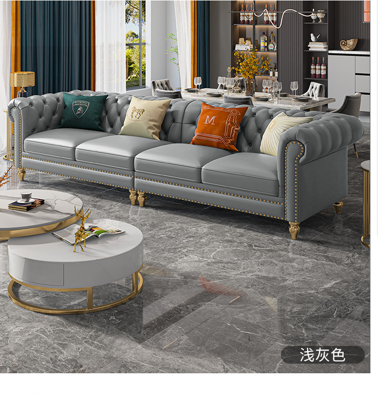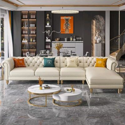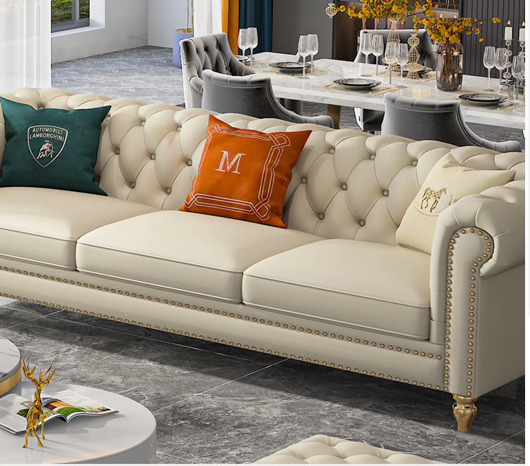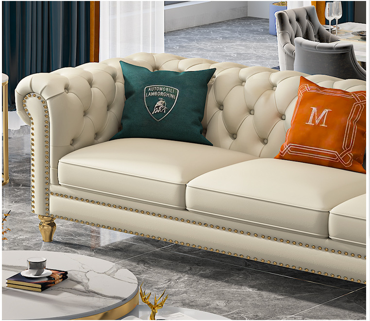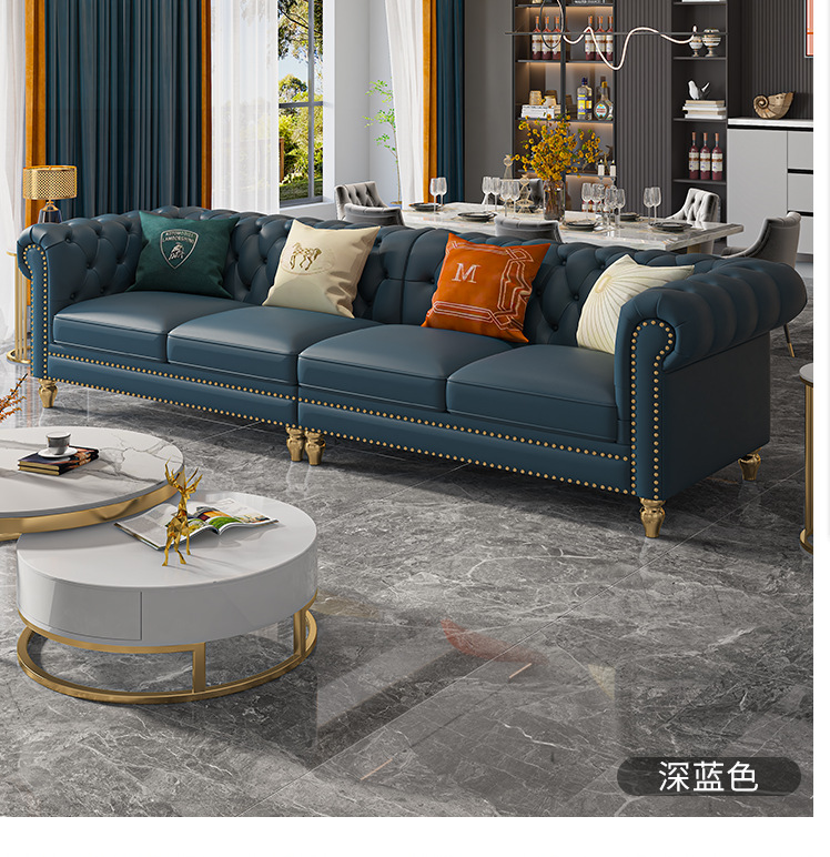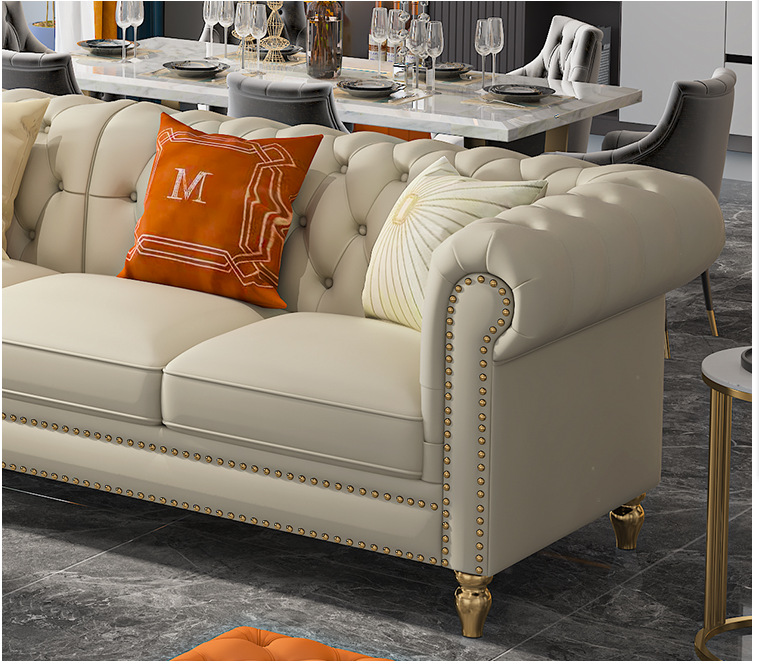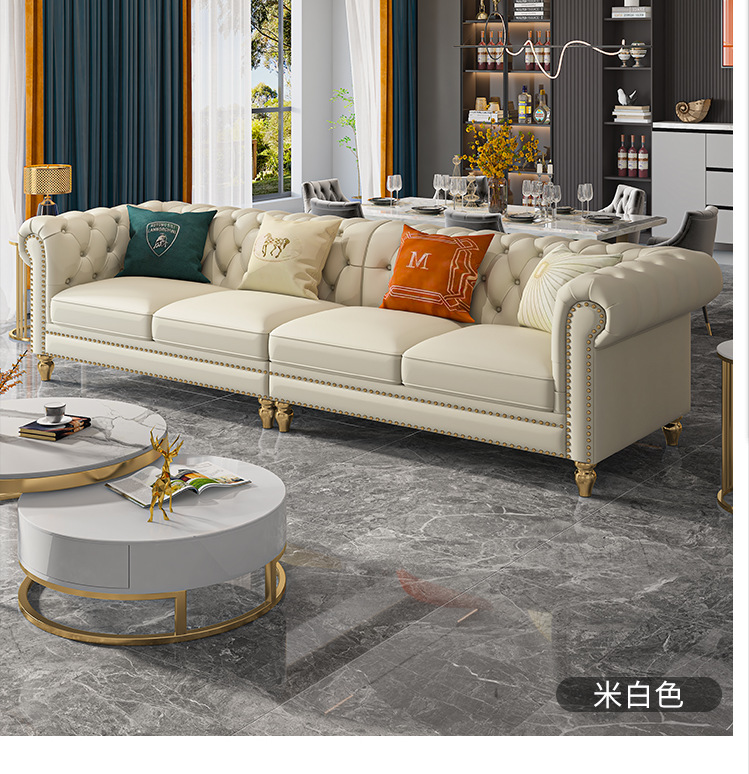 Sofa phòng khách chung cư lớn nhỏ kiểu Mỹ nhẹ sang trọng đầu lớp da bò khóa góc kết hợp ghế đôn đơn giản