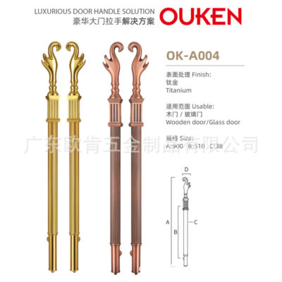 欧肯五金专业生产各种豪华大门拉手把手,淋浴房不锈钢拉手,铜、铝雕刻屏风,不锈钢屏风,浮雕壁画等五金工程配套产品,特别擅长生产各类工程订制五金产品,有专业的设计团队出CAD图,立体效果图等图纸,欢迎各位新老客户莅临本厂指导,共创美好明天。