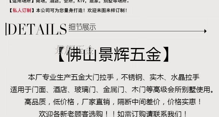 专业生产五金大门拉手,不锈钢、实木、水晶拉手把手,适用于门面、酒店、会所、别墅等玻璃门、金属门、木门使用。高品质,低价格,厂家直销,欢迎各新老顾客选购!!! 咨询电话:18022247698 不刻字大量现货