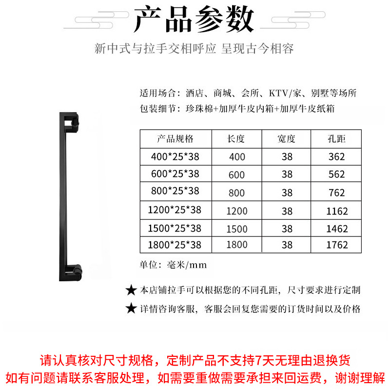 6、定制产品,确认下单后,我们会第一时间安排 生产,一旦确认即进入生产程序,如中途修改或取消需要承担相应的生产费用,定制品非质量问题不支持退货,请知悉。