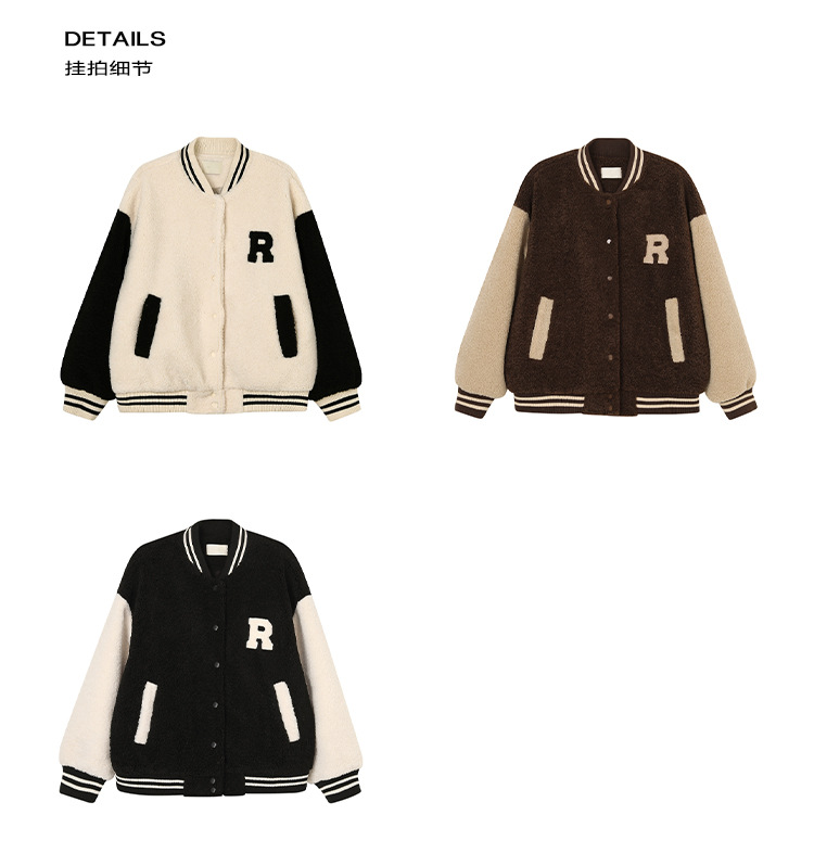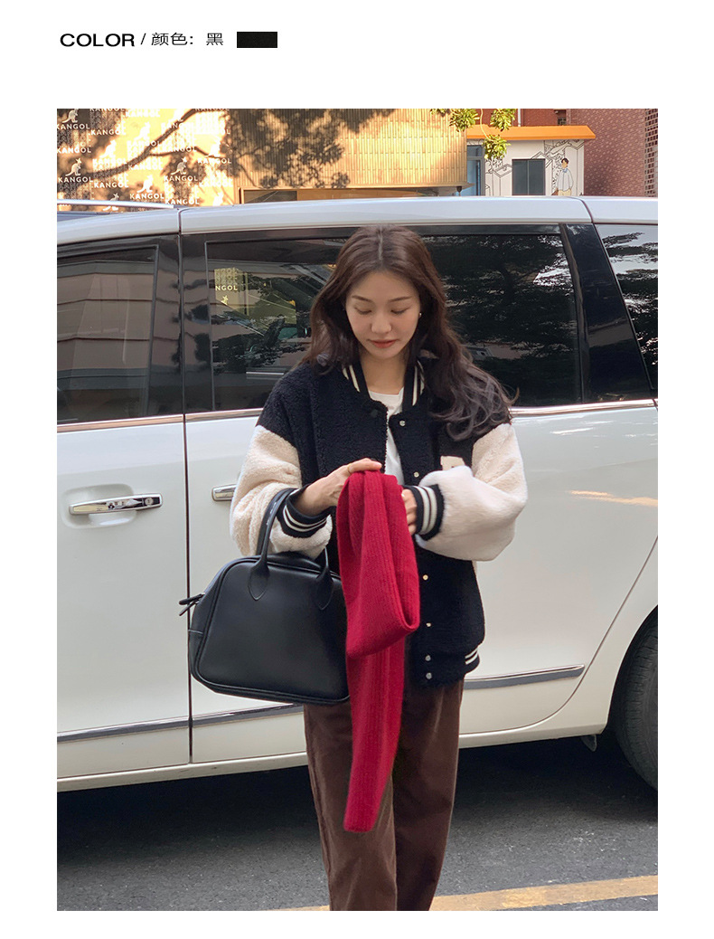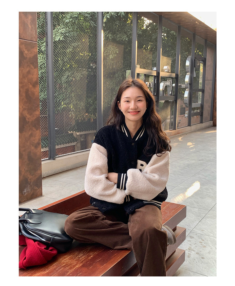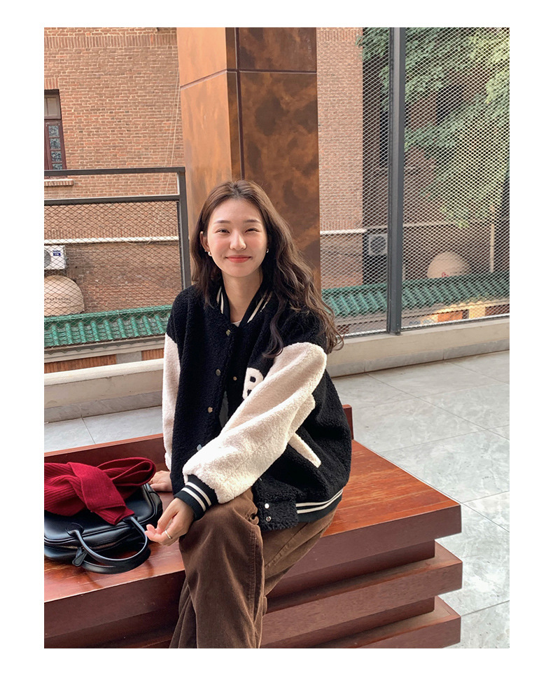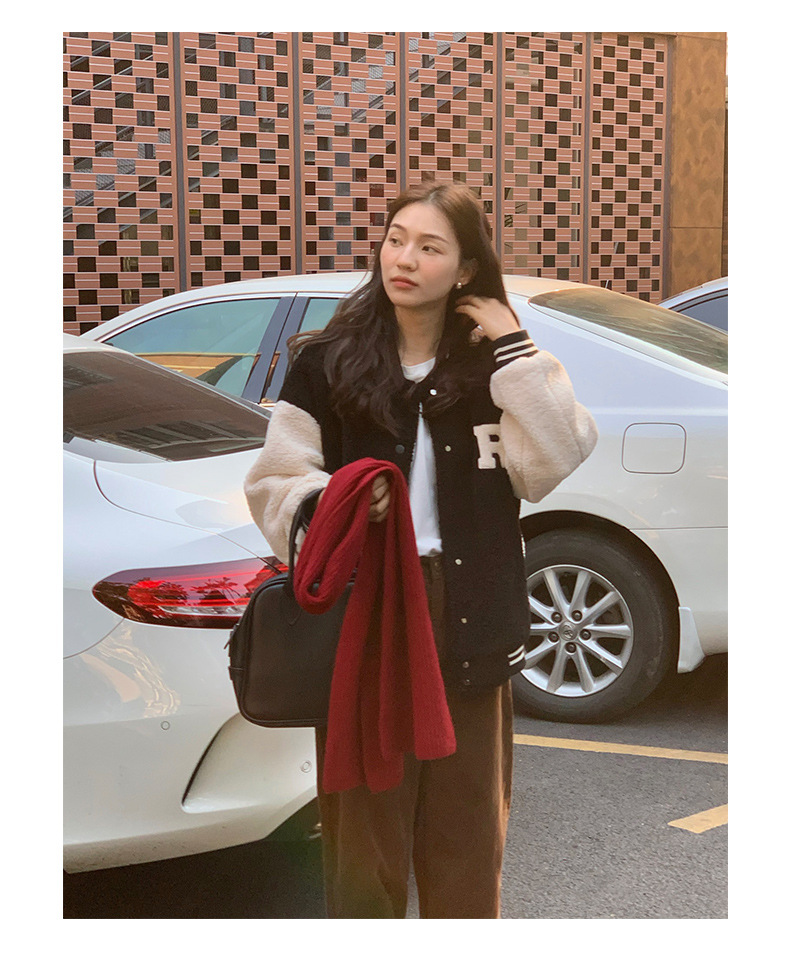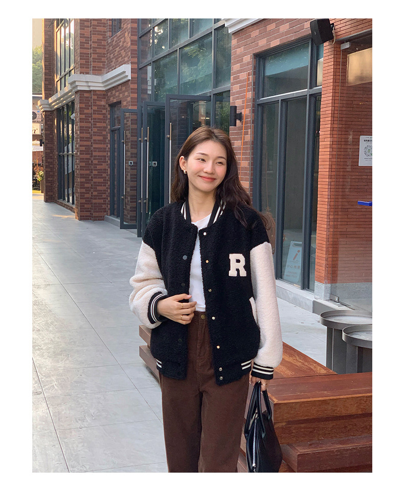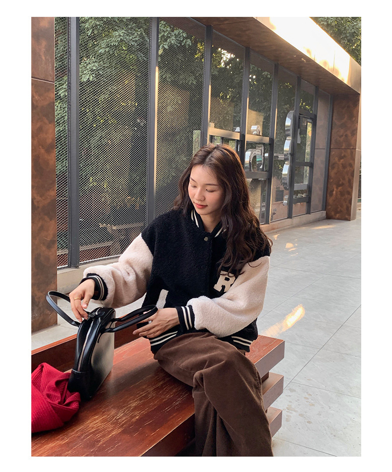 TG Cổ Điển Màu Sắc Tương Phản Retro Len Cừu Đồng Phục Bóng Chày Nữ Mùa Đông 2022 Mới Rời Chữ Áo Khoác Dày 18356