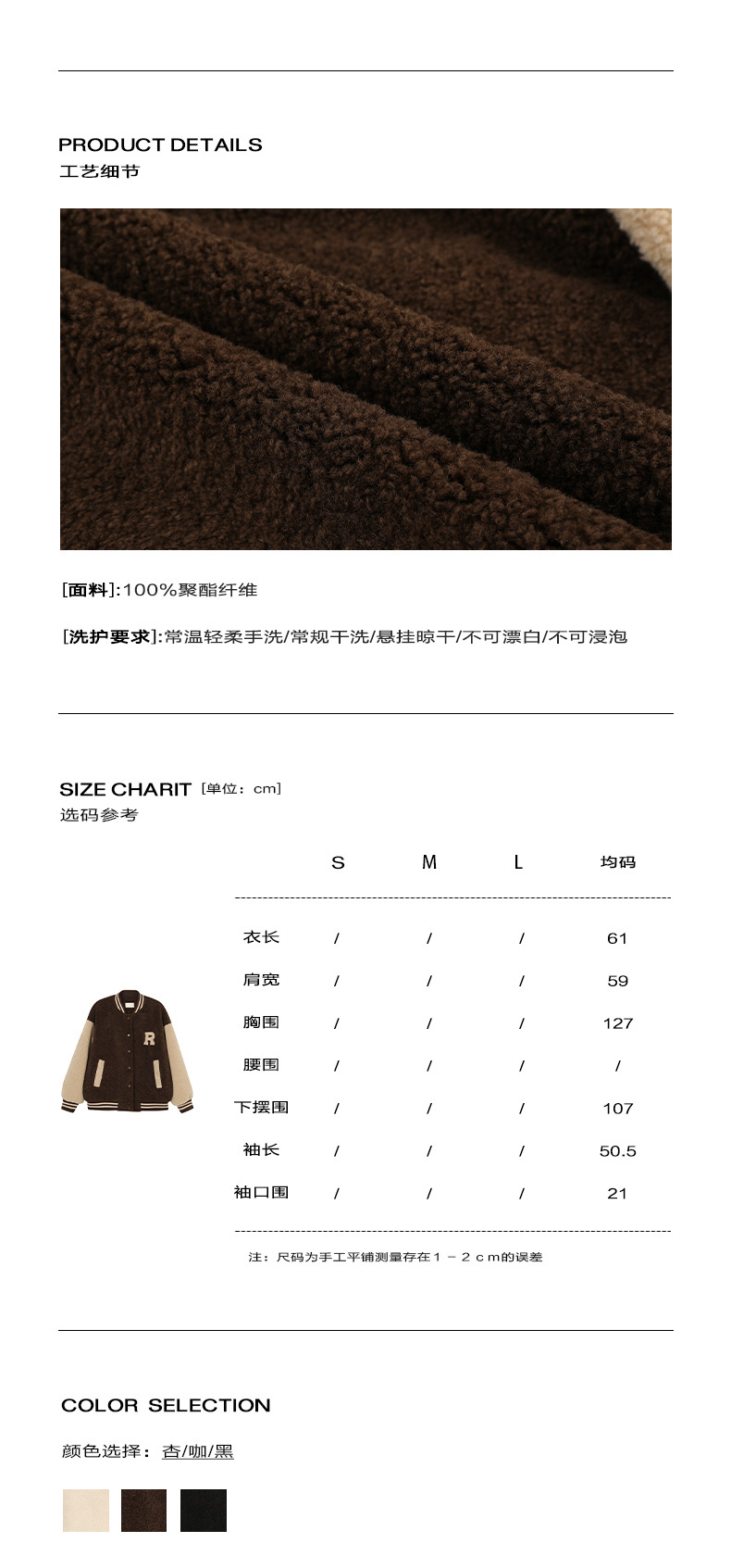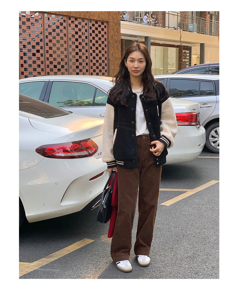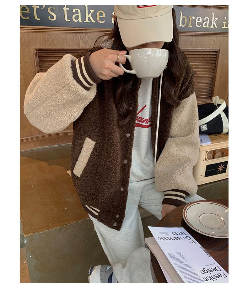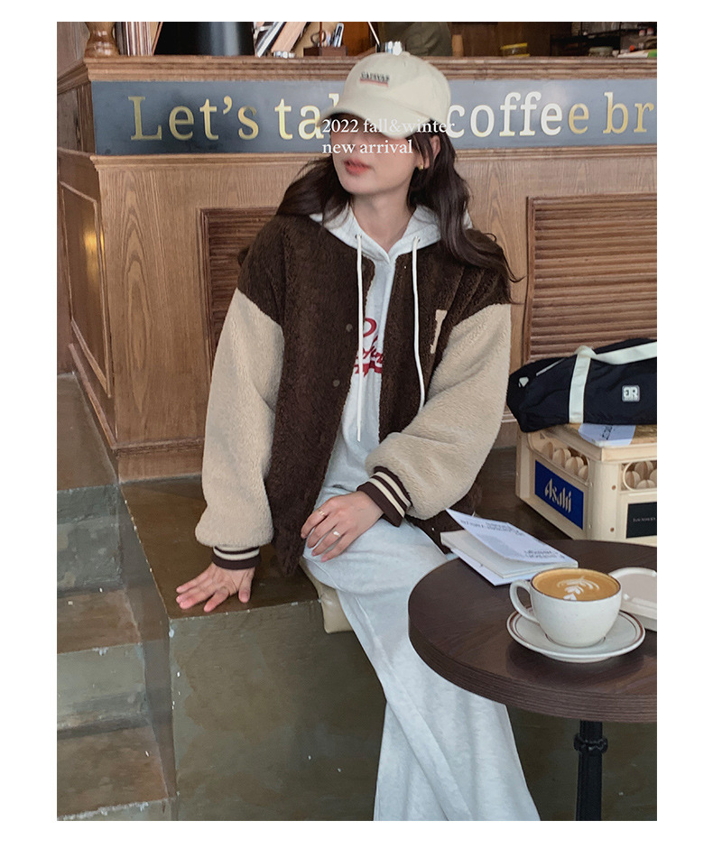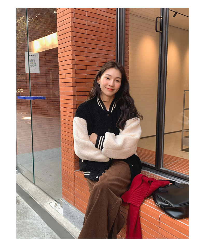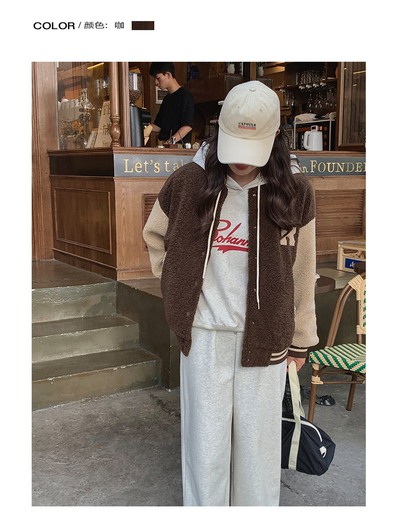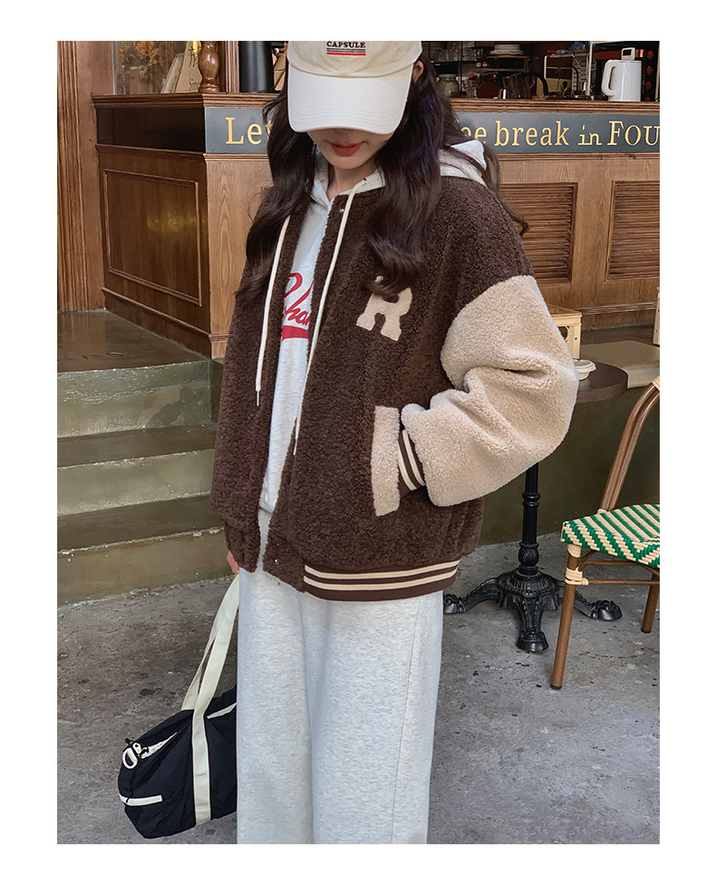 TG Cổ Điển Màu Sắc Tương Phản Retro Len Cừu Đồng Phục Bóng Chày Nữ Mùa Đông 2022 Mới Rời Chữ Áo Khoác Dày 18356