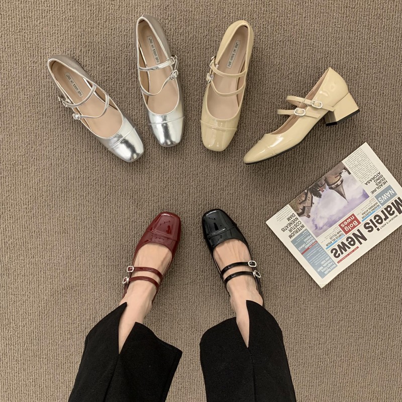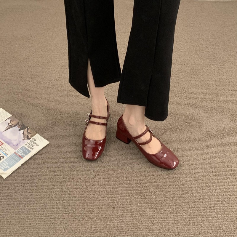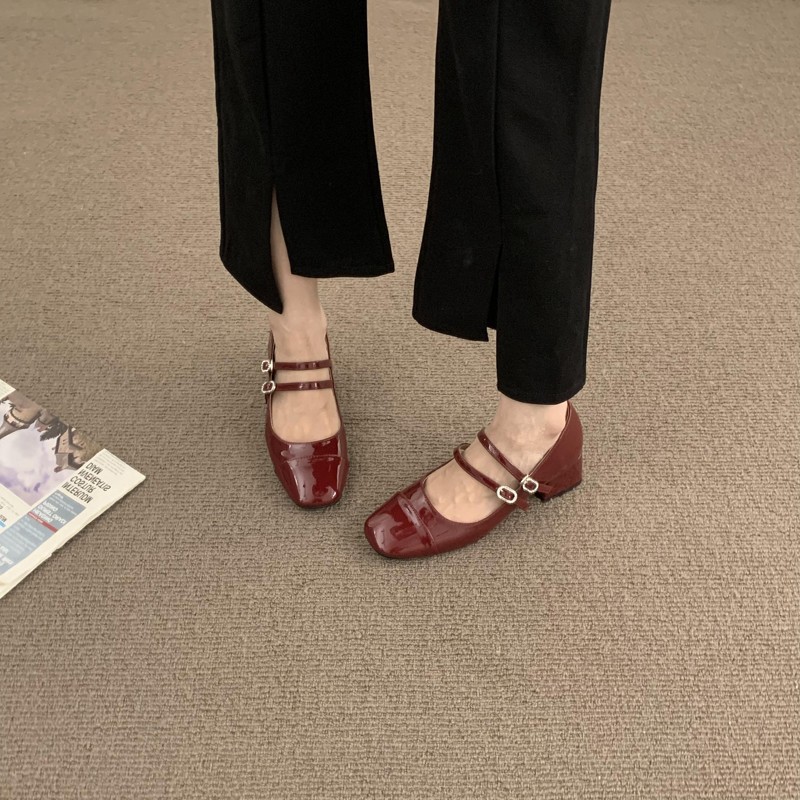 Thắt lưng khóa một từ Mary Jane mũi vuông giày đơn gót dày giày nữ 2023 mới giày nhỏ gót vừa màu đỏ da sáng