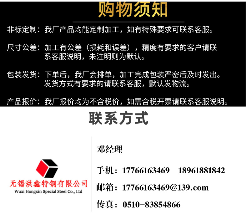 不锈钢市场价格波动较大,并且因材质、规格、数量不同,价格差异较大,以上参数说明及价格仅供参考,具体价格请电话咨询或阿里旺旺咨询,以咨询实际报价为准。如未与我司销售人员沟通,直接下单者,我公司概不发货,谢谢理解。