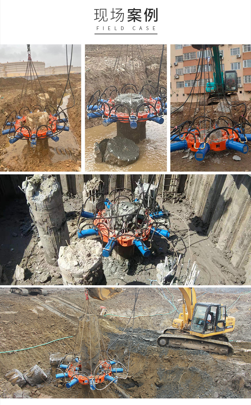 1. 破桩机通过动力源给破桩机多个油缸提供压力,油缸直接驱动钎杆,同时挤压桩身,使桩头截除。破桩机施工中,操作简单,—率,低噪音,低成本,适用于桩群施工工程中。破桩机采用高度模块化组合,通过销轴联接模块,可以通过不同模块数量组合,截除一定范围内直径桩头。
