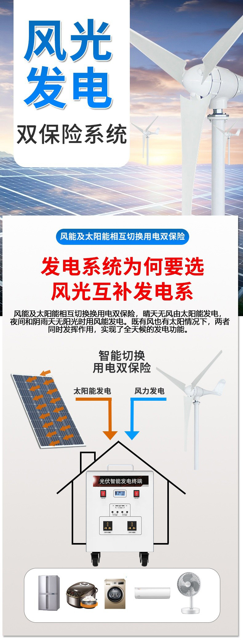 Thiết bị phát điện hỗn hợp năng lượng mặt trời gió nhỏ hộ gia đình 220V biến tần DC gắn trên xe sạc bảng hệ thống năng lượng mặt trời