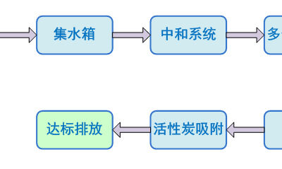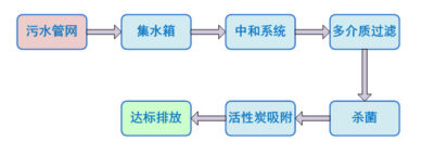 废水经集水箱收集均质后,流入中和反应箱同时根据水质性质加入定量酸(碱)溶液进行中和反应,中和后的废水有提升泵抽至过滤罐进行过滤,抽废水的同时也抽入定量的净水剂溶液,使废水中的污染物进行絮凝反应,从而提高过滤效果。过滤后的清水通过紫外线杀菌器杀菌后流入生物活性炭罐,使微细污染物进一步得到拦截并被吸附消解,经处理后的清水直接排入城市下水道管网。