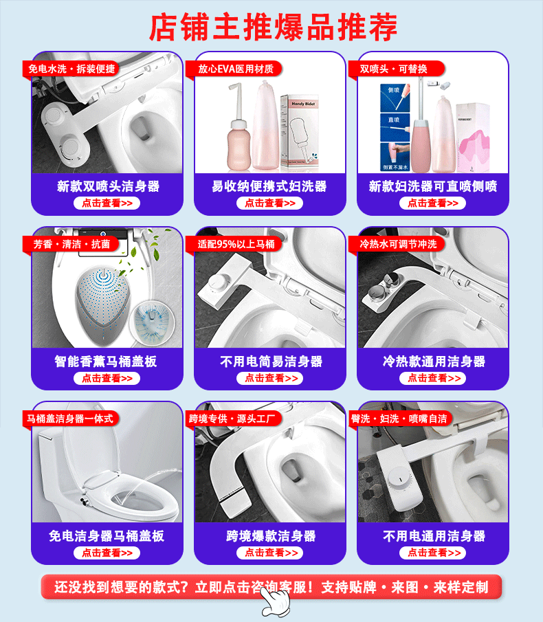 三、此款洁身器为单冷水双喷头设计,专利外观,有喷嘴自洁、臀洗、妇洗、水压调节等功能。