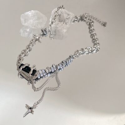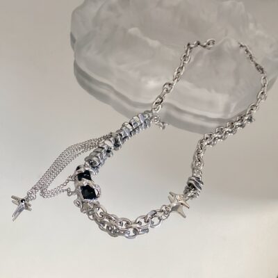 Thiết kế ngách mới quanh co đá quý màu đen thêu chữ thập vòng cổ cho nam và nữ cao cấp bungee dây chuyền xương đòn bằng thép titan thủy triều
