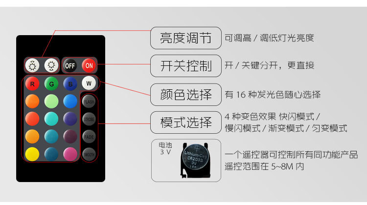 4.透色光效果好,红、绿、黄、蓝、紫、青 、白等单色显示,梦幻七彩渐变,光线柔和,有定色功能,还有四种flash自动闪光模式可供选择,可通 过遥控器按键控制,达到不同的发光效果,随意选择喜好色彩,视觉享受,更增添缤纷色彩。