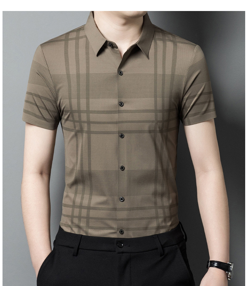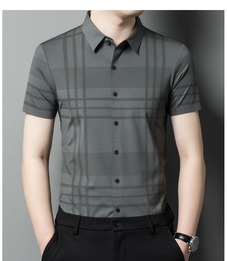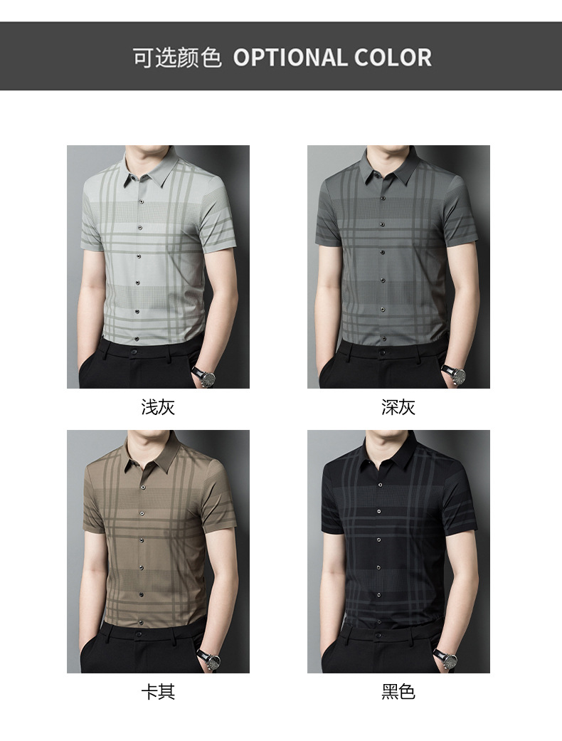 Thời trang mùa hè nam lụa băng liền mạch sọc ngắn tay áo sơ mi nam tự trồng kinh doanh chuyên nghiệp cao cấp không cần ủi áo sơ mi nam