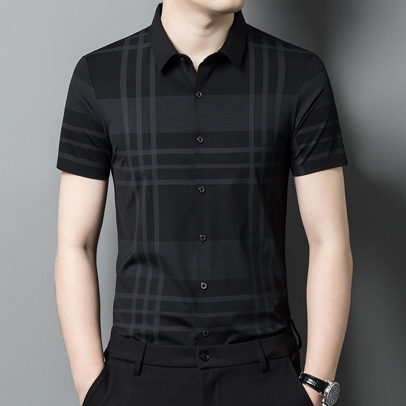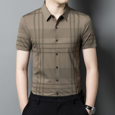Thời trang mùa hè nam lụa băng liền mạch sọc ngắn tay áo sơ mi nam tự trồng kinh doanh chuyên nghiệp cao cấp không cần ủi áo sơ mi nam