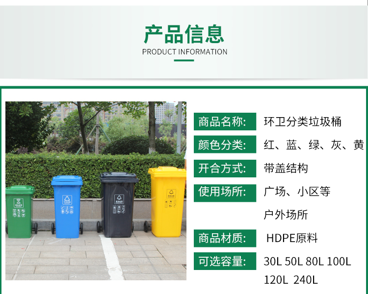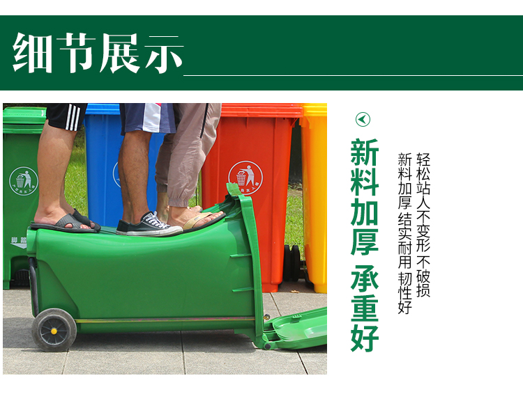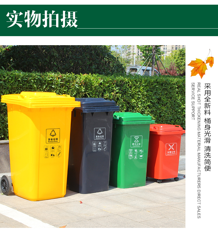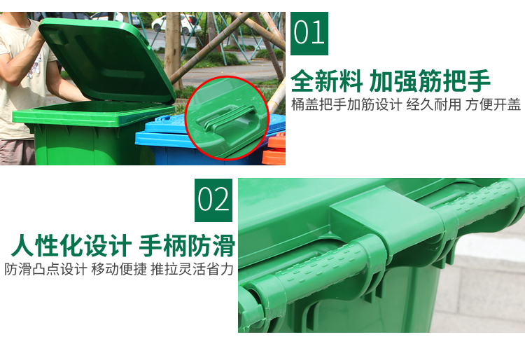 Sản phẩm nổi bật với các đặc điểm: Thùng rác 240L ngoài trời kích thước lớn có nắp 100l công suất lớn thương mại kích thước lớn phân loại xe kéo bất động sản vệ sinh cộng đồng