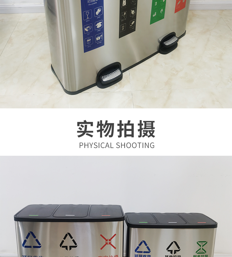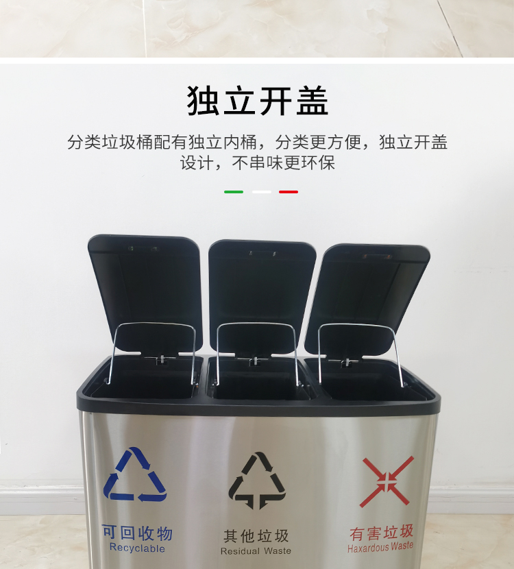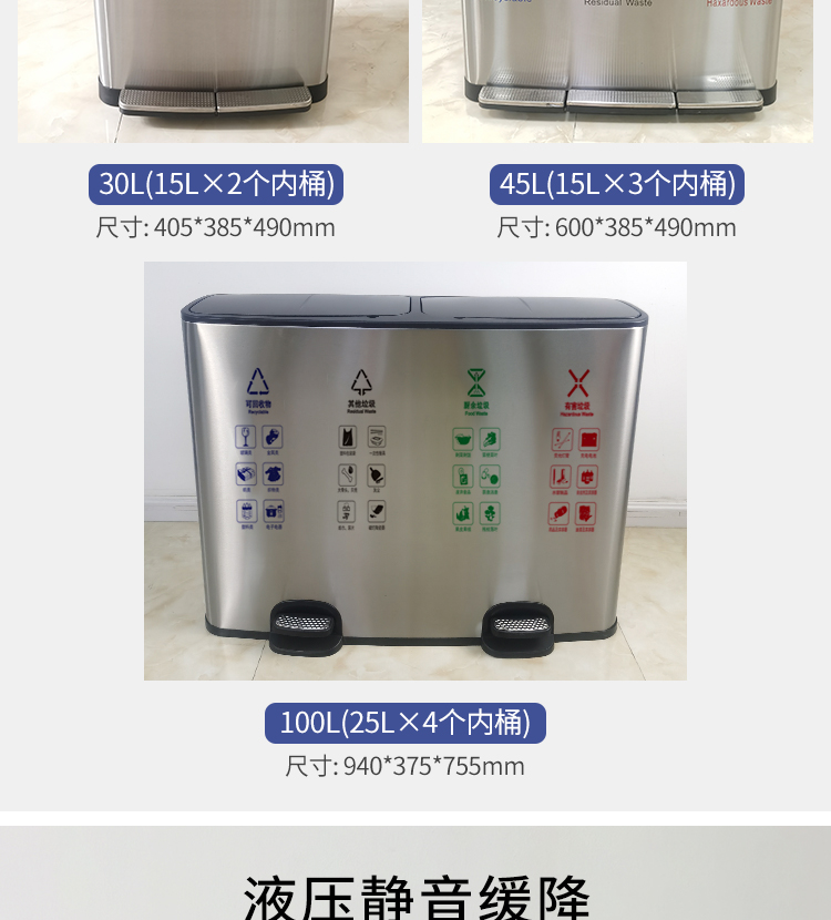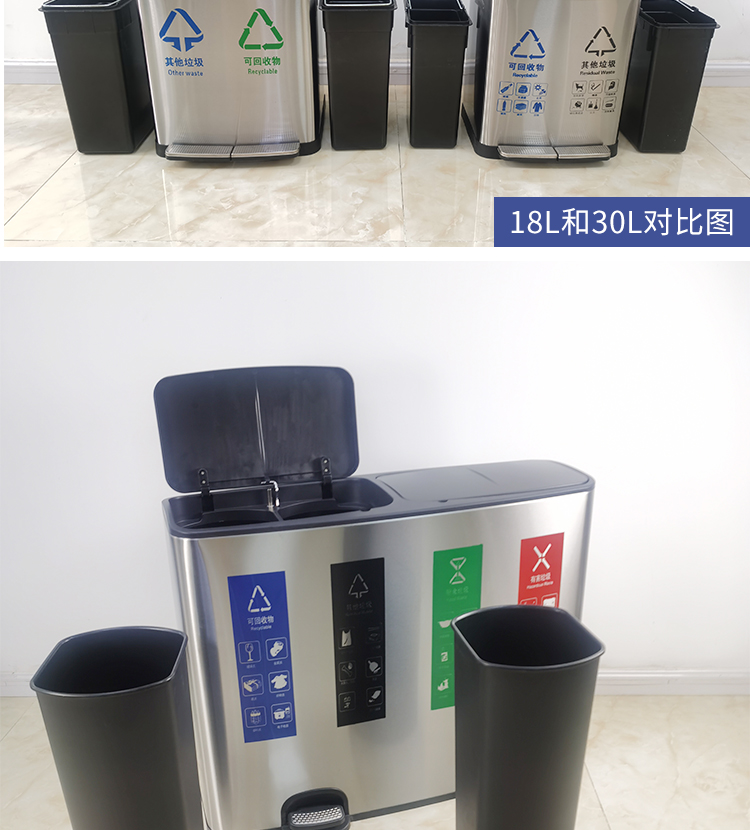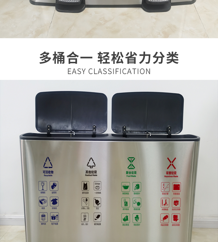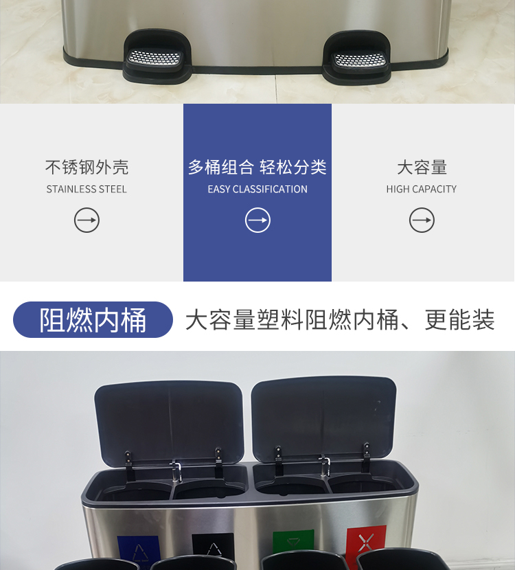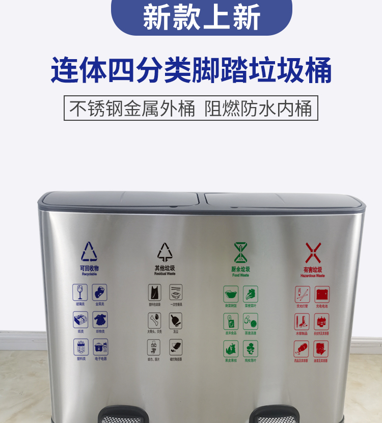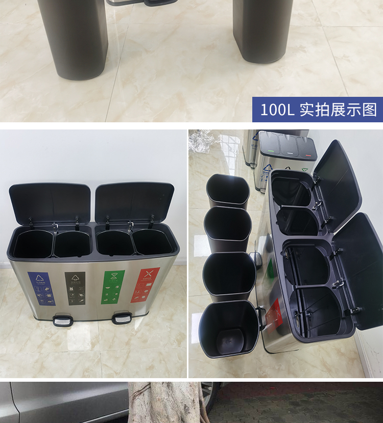 Thùng rác 4 phân loại có bàn đạp bằng thép không gỉ có nắp đậy 100 lít dung tích lớn trung tâm mua sắm khách sạn phân loại hộp da trái cây