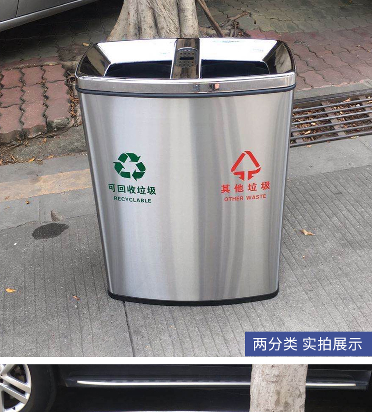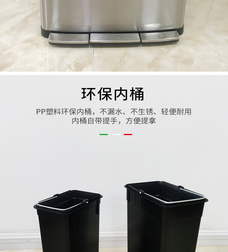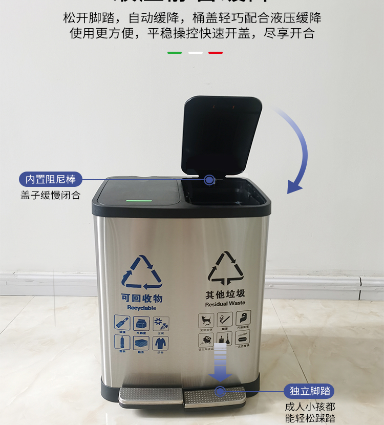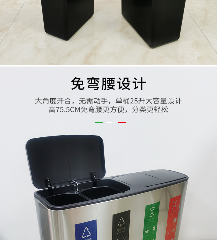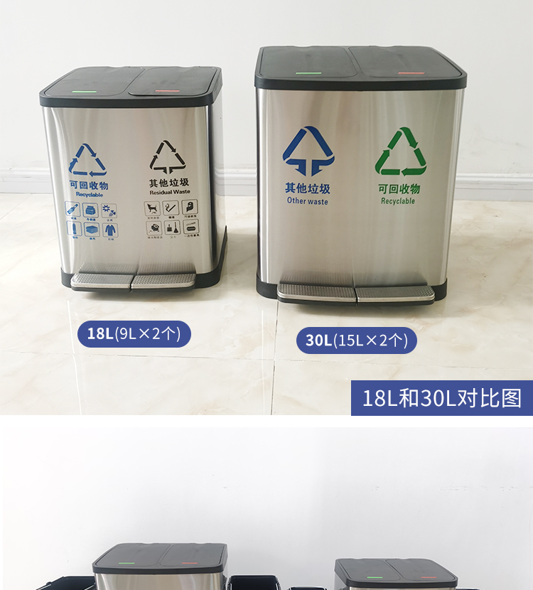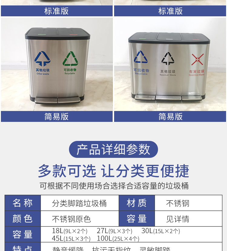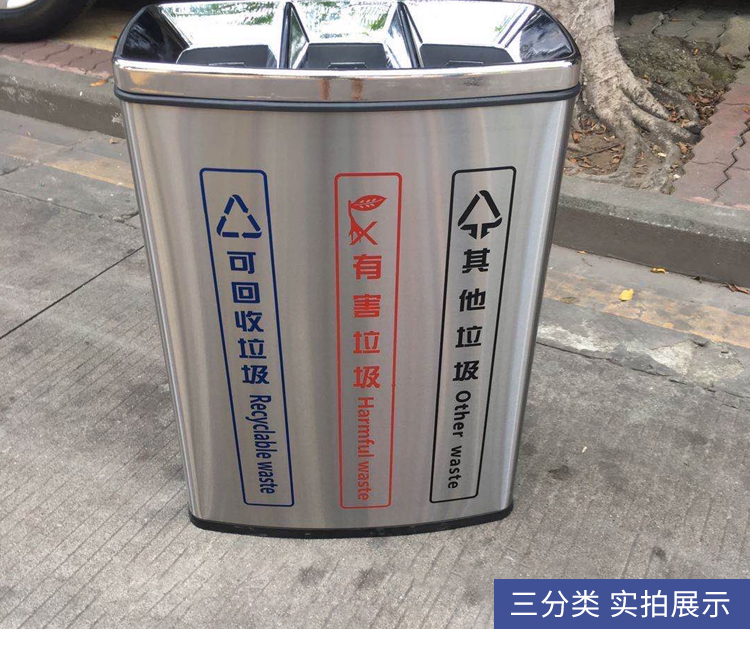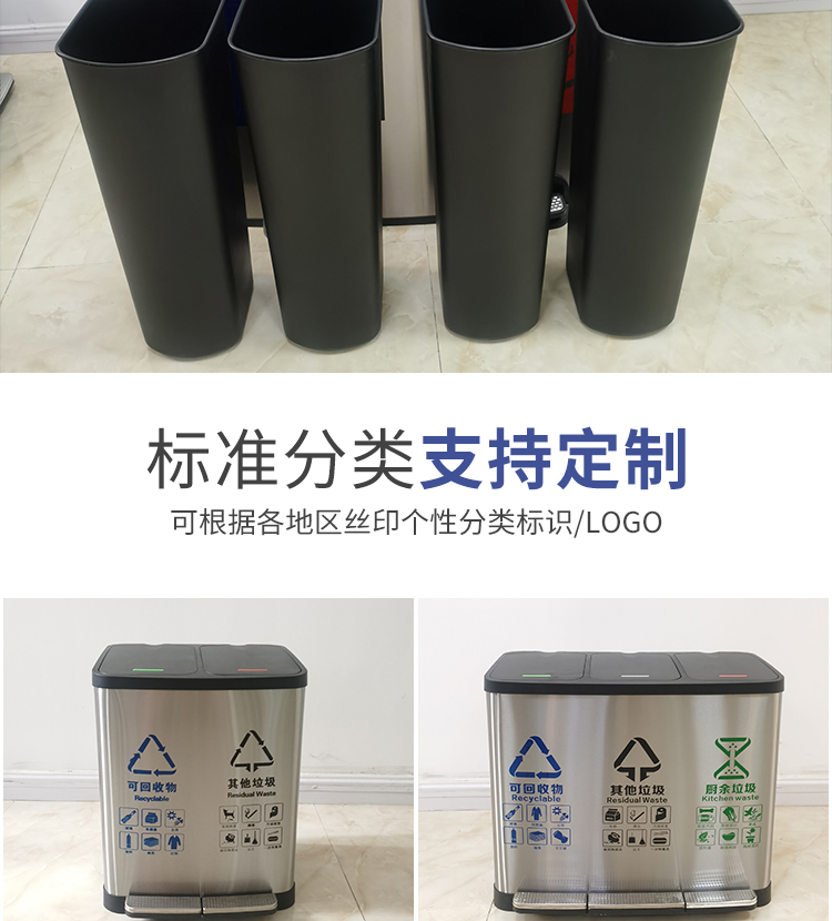 Thùng rác 4 phân loại có bàn đạp bằng thép không gỉ có nắp đậy 100 lít dung tích lớn trung tâm mua sắm khách sạn phân loại hộp da trái cây
