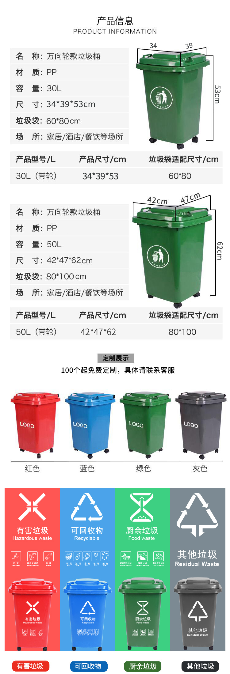 Thùng rác có bánh xe 50 lít thương mại công suất lớn có nắp đậy vệ sinh lớn ngoài trời ăn uống trái cây hộp da nhà bếp gia đình
