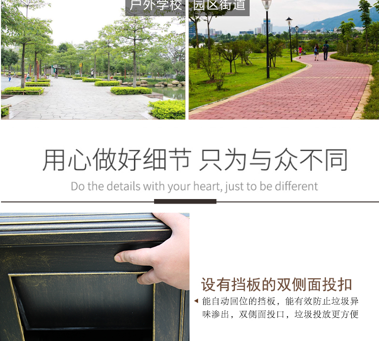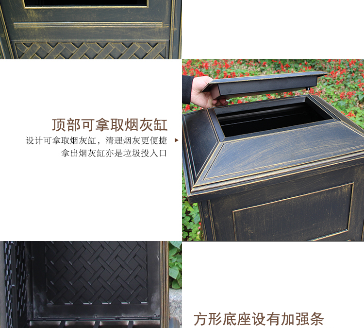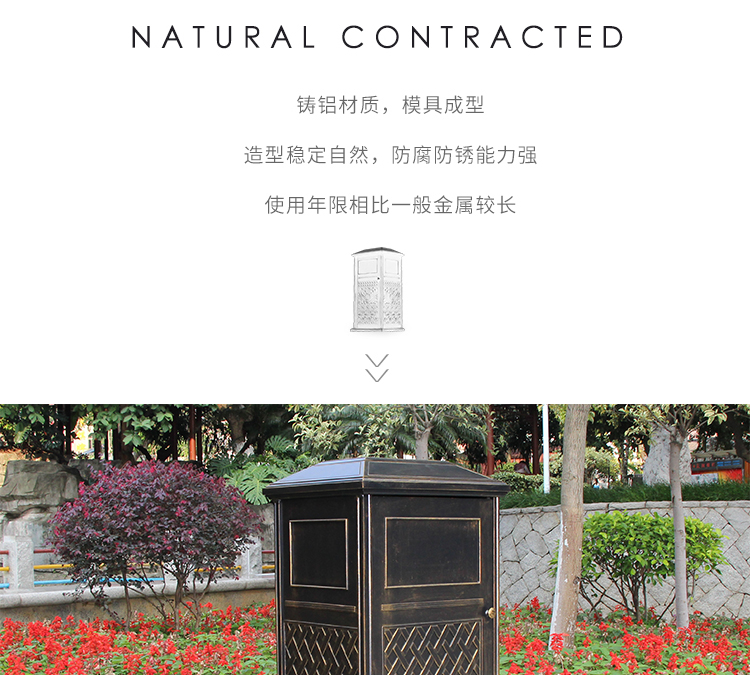 Sản phẩm nổi bật với các đặc điểm: Khung cảnh lối đi bằng nhôm đúc ngoài trời thùng rác hợp kim nhôm Hộp bóc phong cách Châu Âu công viên ven đường thùng rác phân loại ngoài trời