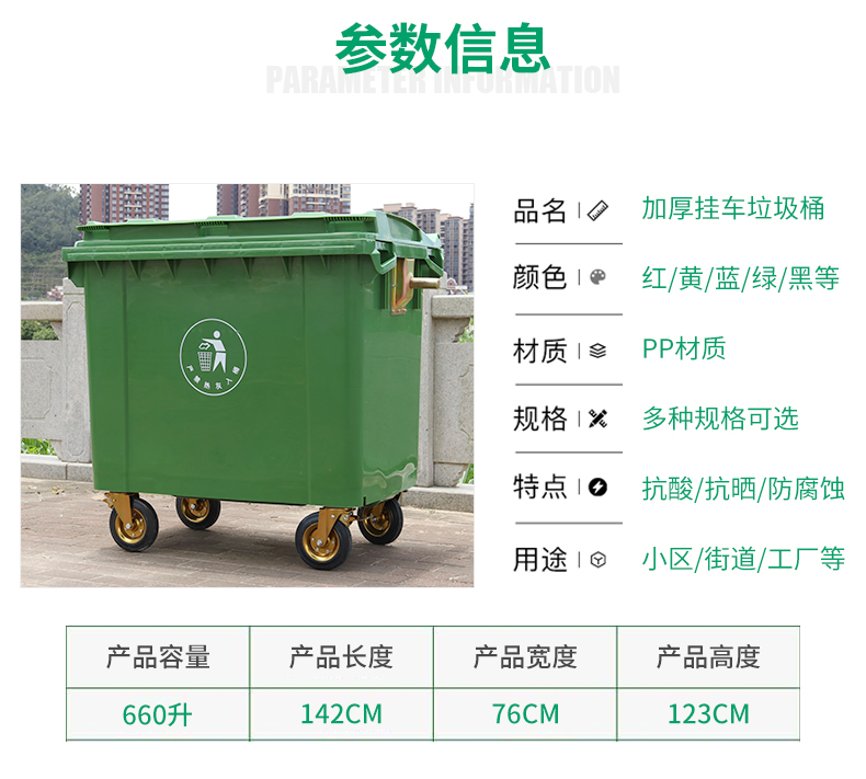 Sản phẩm nổi bật với các đặc điểm: Thùng rác ngoài trời 660 lít L thùng vệ sinh lớn thương mại có nắp thùng rác kéo dài công suất lớn thùng rác thùng rác lớn