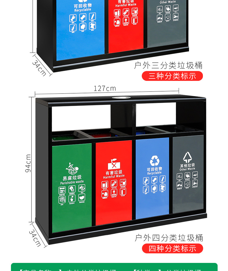 Thùng rác ngoài trời, bốn loại, thép không gỉ, nơi công cộng, ba loại, thùng rác thương mại lớn ngoài trời, vệ sinh