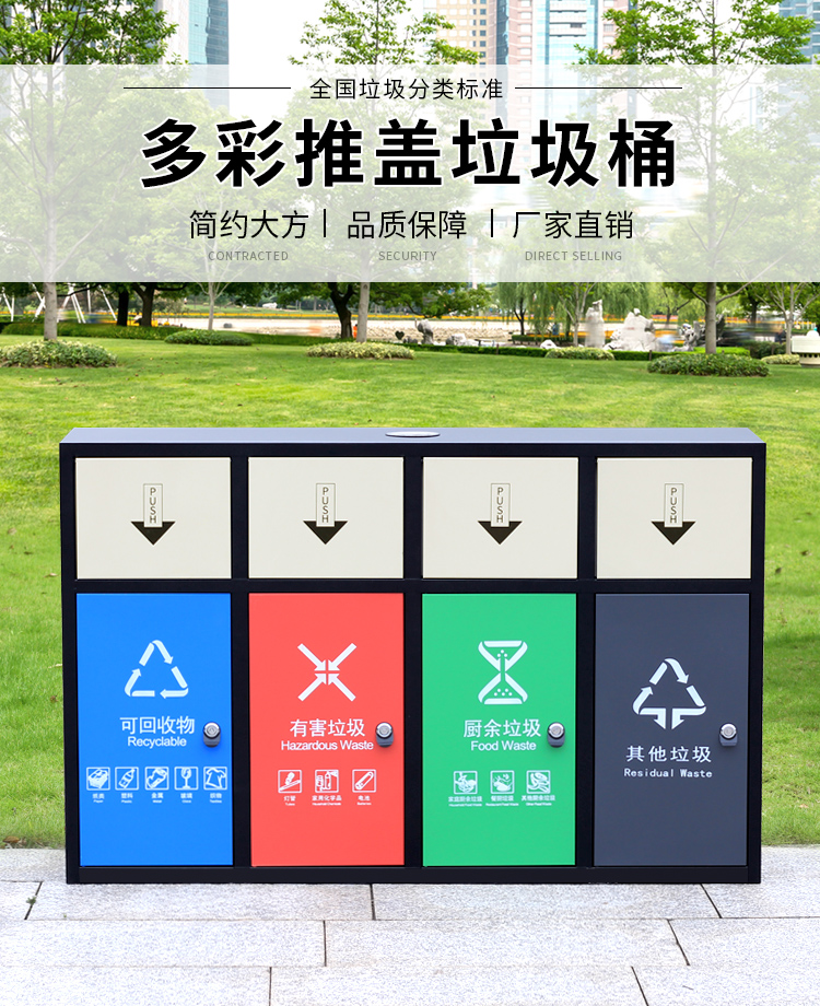 Sản phẩm nổi bật với các đặc điểm: Thùng rác ngoài trời bốn phân loại Xiêm có nắp hộp ngoài trời cộng đồng phân loại bằng thép không gỉ thùng rác lớn