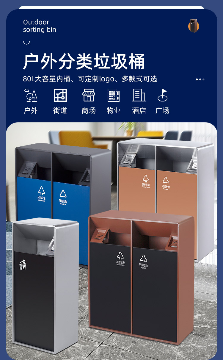 Sản phẩm nổi bật với các đặc điểm: Thùng rác ngoài trời thùng rác bằng thép không gỉ sảnh khách sạn dọc thương mại với hộp da gạt tàn tùy chỉnh phân loại thùng đựng tro