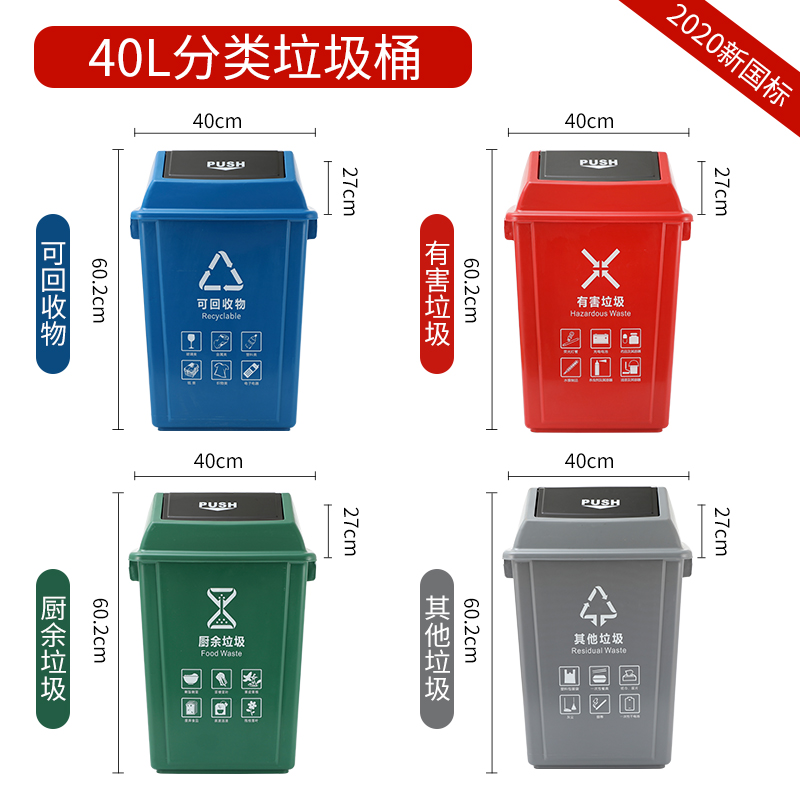 Sản phẩm nổi bật với các đặc điểm: Phân loại có nắp thùng rác nhà bếp lớn bốn màu nhà hàng thương mại phục vụ nhà bếp có thể tái chế chất thải nhà bếp có hại ngoài trời