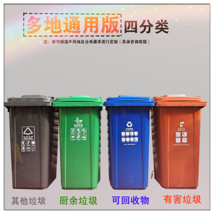 多地通用版:灰色(其他垃圾) 绿色(厨余垃圾) 红色(有害垃圾) 蓝色(可回收物)