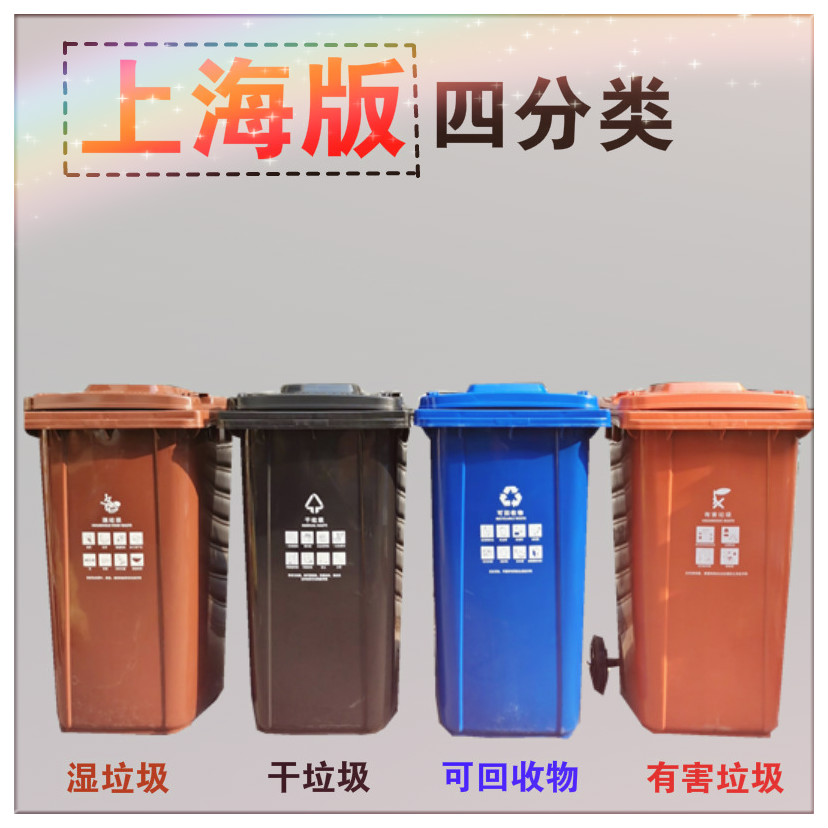 上海版:黑色(干垃圾) 咖啡色(湿垃圾) 红色(有害垃圾) 蓝色(可回收物)