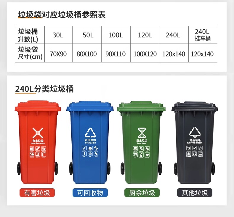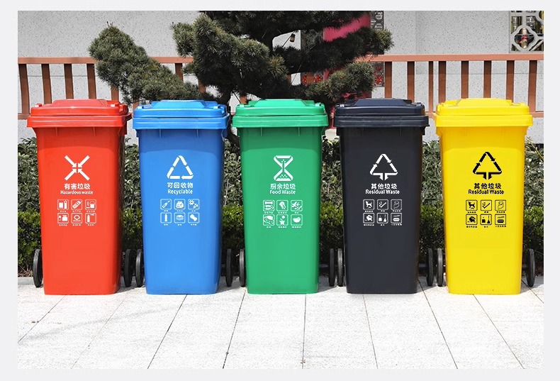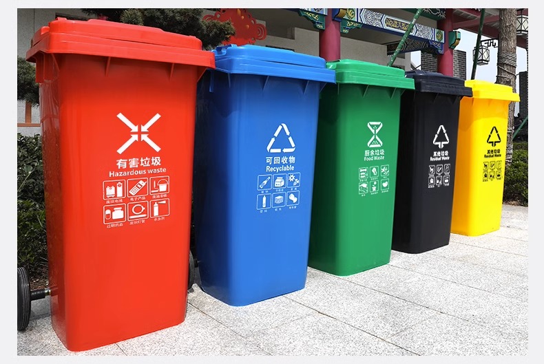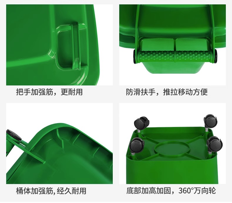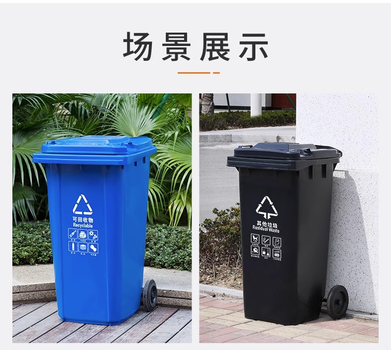 Thùng rác phân loại ngoài trời 240l có nắp đậy có bánh xe, vệ sinh cộng đồng thương mại công suất lớn thùng rác tách khô và ướt là lựa chọn lý tưởng cho không gian công cộng, sân vườn hoặc khu đô thị. Sản phẩm giúp nâng cao hình ảnh chuyên nghiệp và sạch đẹp cho môi trường sống.