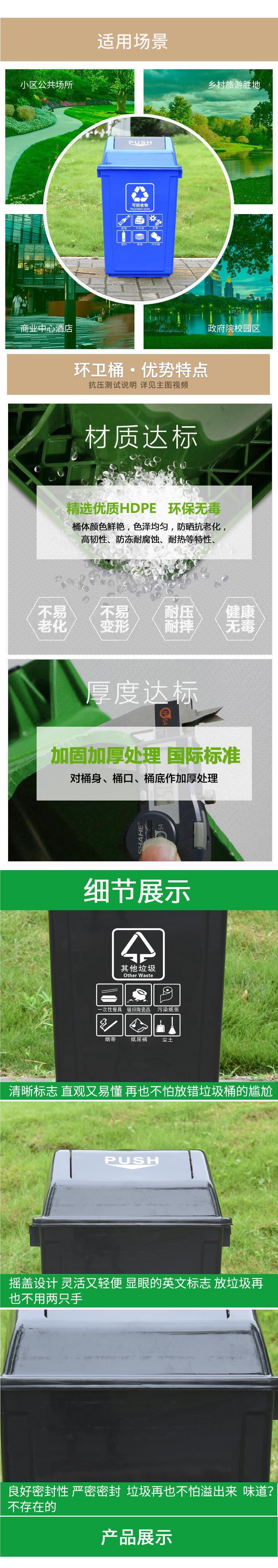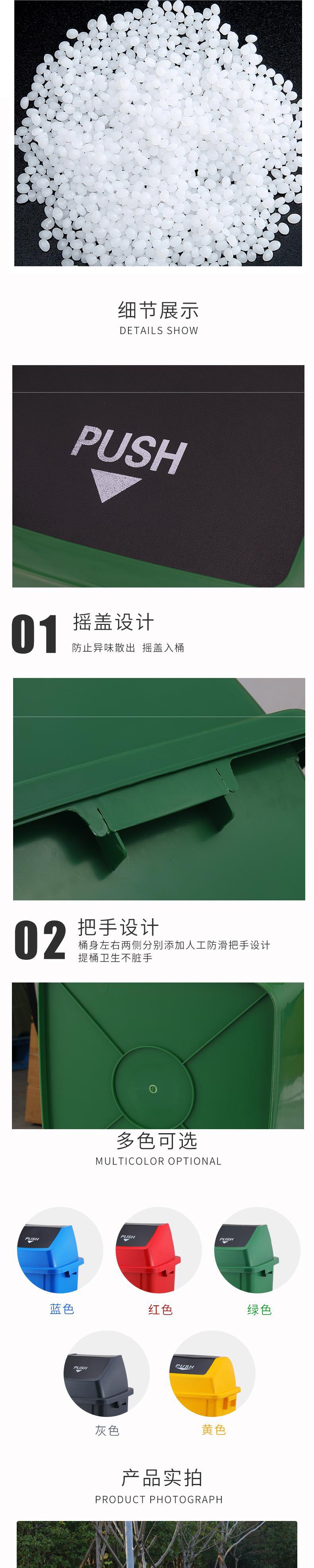 Thùng rác phân loại rác có nắp, xe kéo dày lớn ngoài trời, hàng gia dụng bốn màu xanh lam, xám, đỏ và xanh lá cây có hại là lựa chọn lý tưởng cho không gian công cộng, sân vườn hoặc khu đô thị. Sản phẩm giúp nâng cao hình ảnh chuyên nghiệp và sạch đẹp cho môi trường sống.